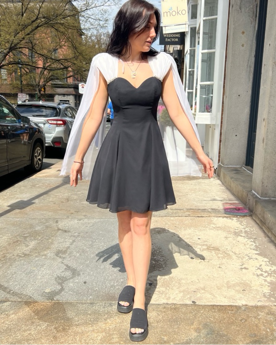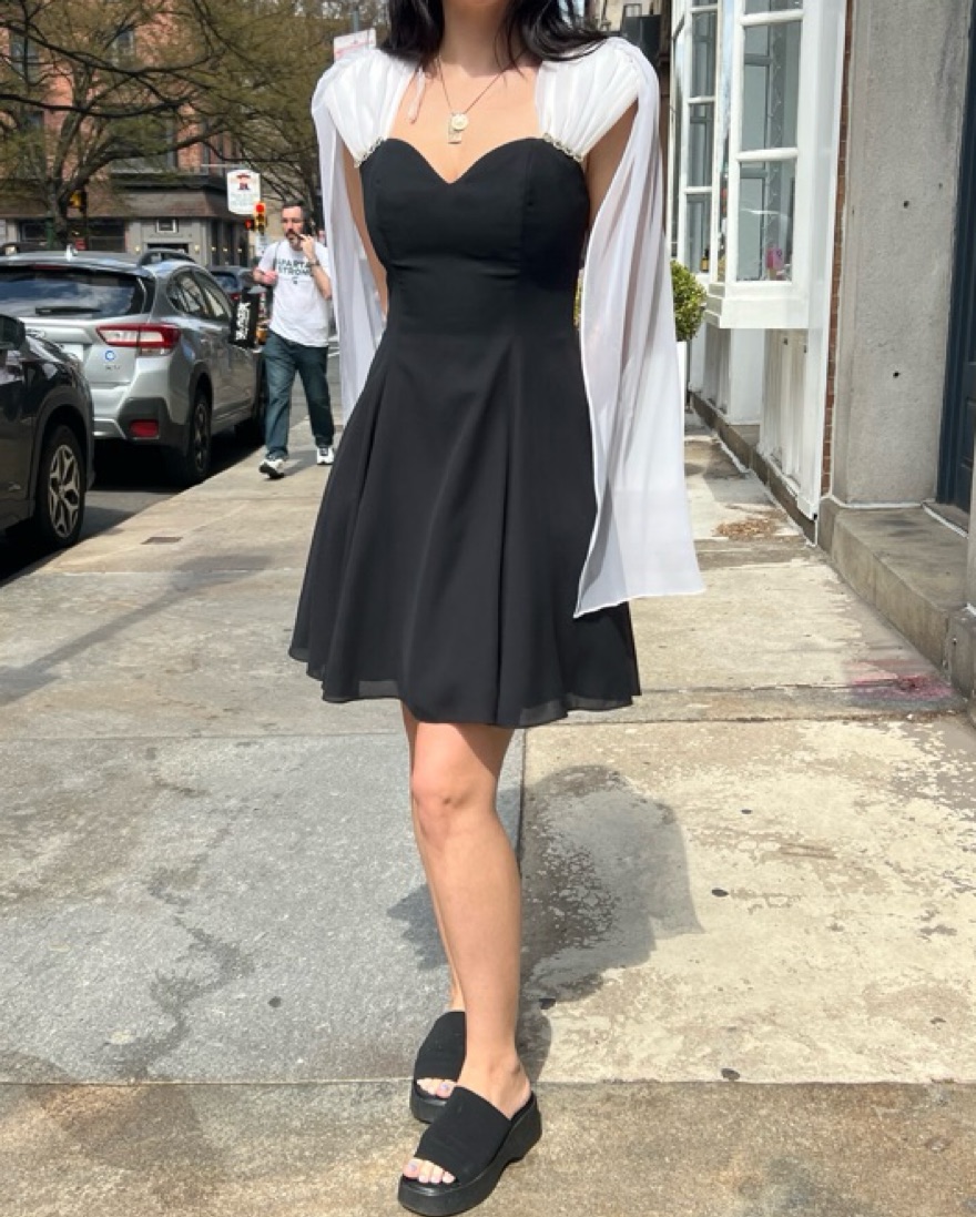 Vintage black dress featuring a sweetheart neckline and white shoulder drapes for a cape like effect. Marked as a size 4