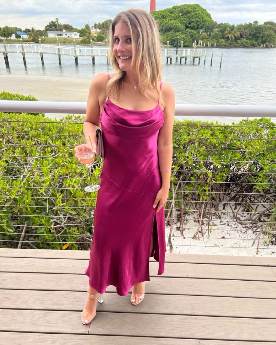 XS. Super comfortable. Perfect for spring/summer wedding!! Midi dress but i am 5ft tall so was ankle length on me. Has adjustable straps!