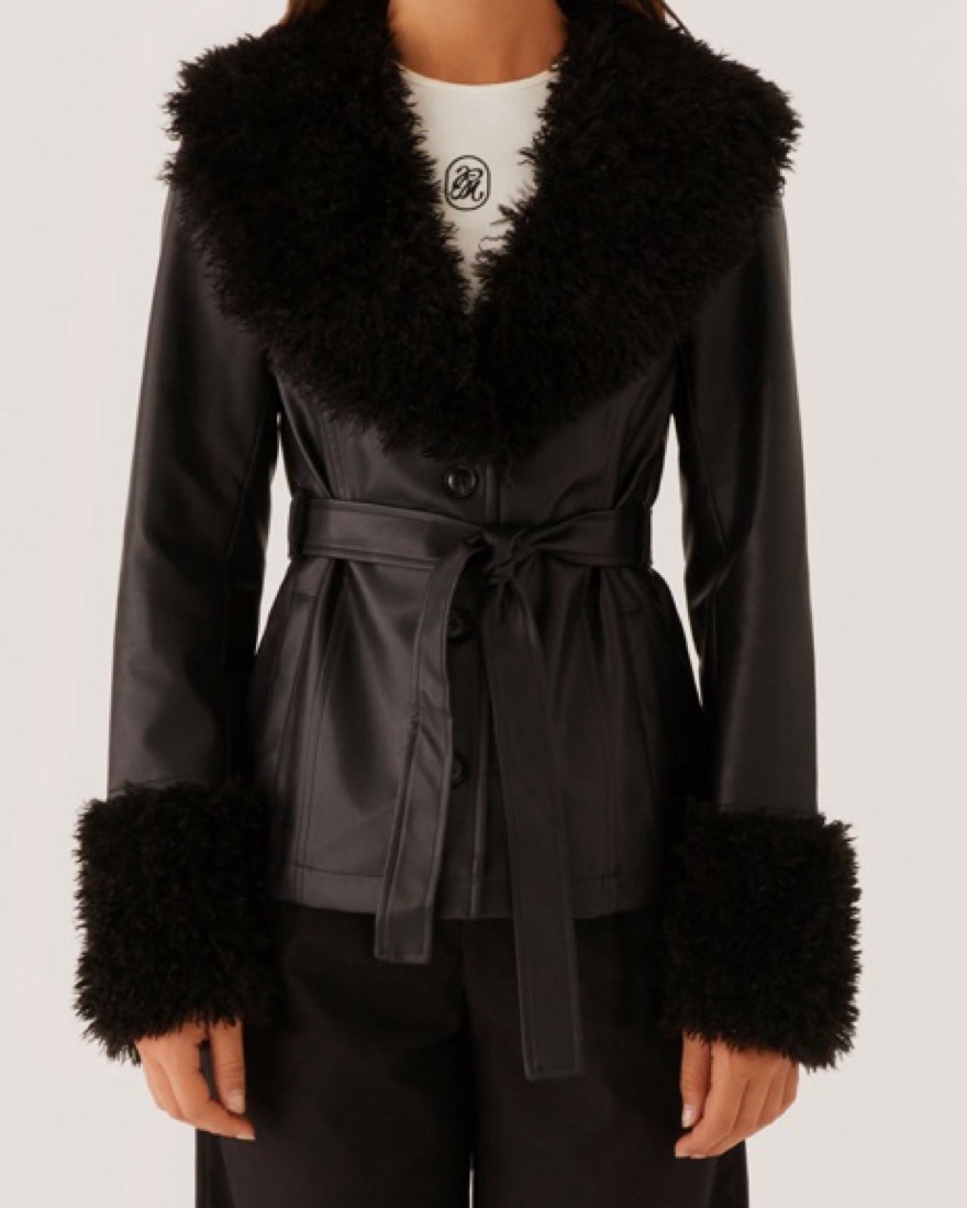 - V neckline - Fur feel cuff and collar - Belt loop and belt around waist - Front clip button - Fully lined - Leather feel - Fabric: Fur: 100% Polyester, Leather: 100% PU, Lining: 100% Polyester