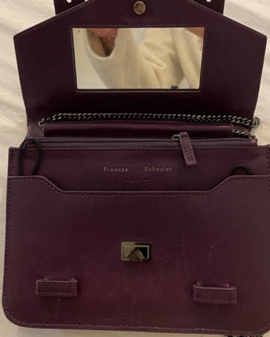 Lightly work Proenza Mini PS1 wallet on a chain in purple