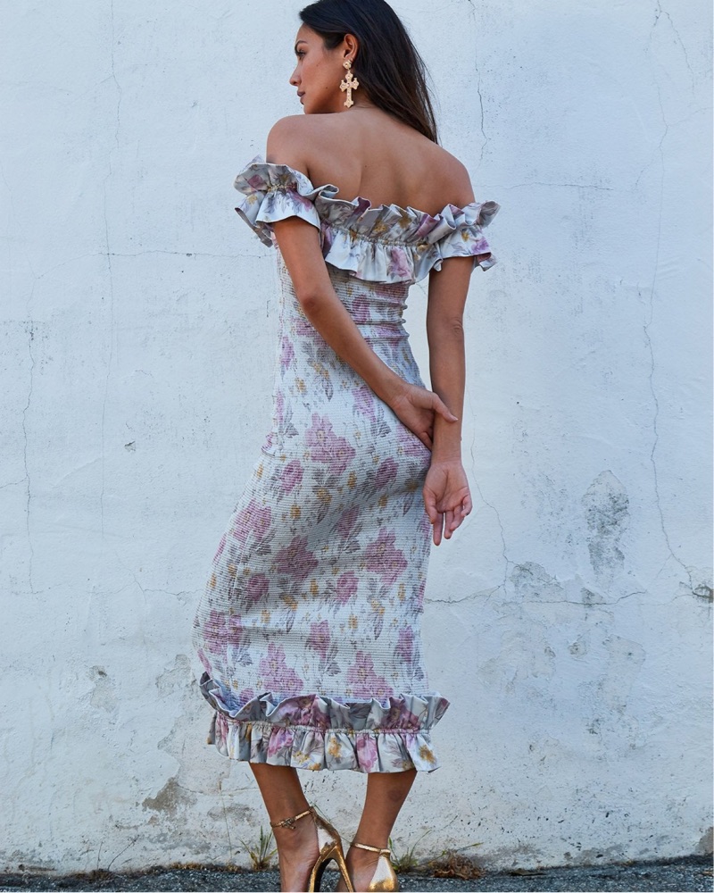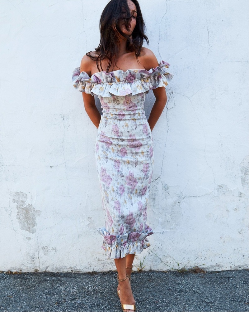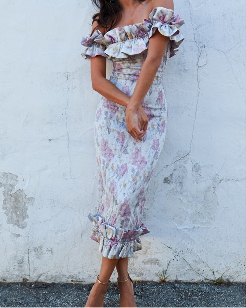 Form-fitting midi dress with ruffle accents. Purple floral pattern. So comfy!