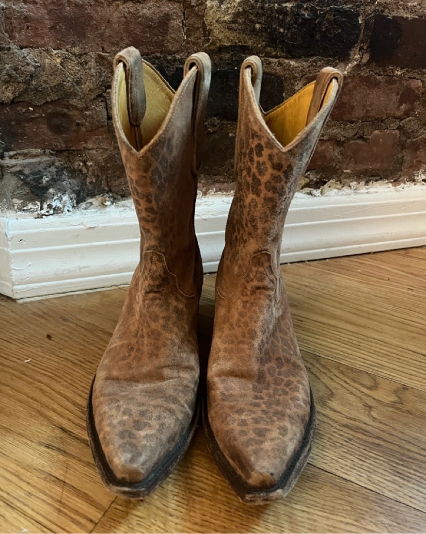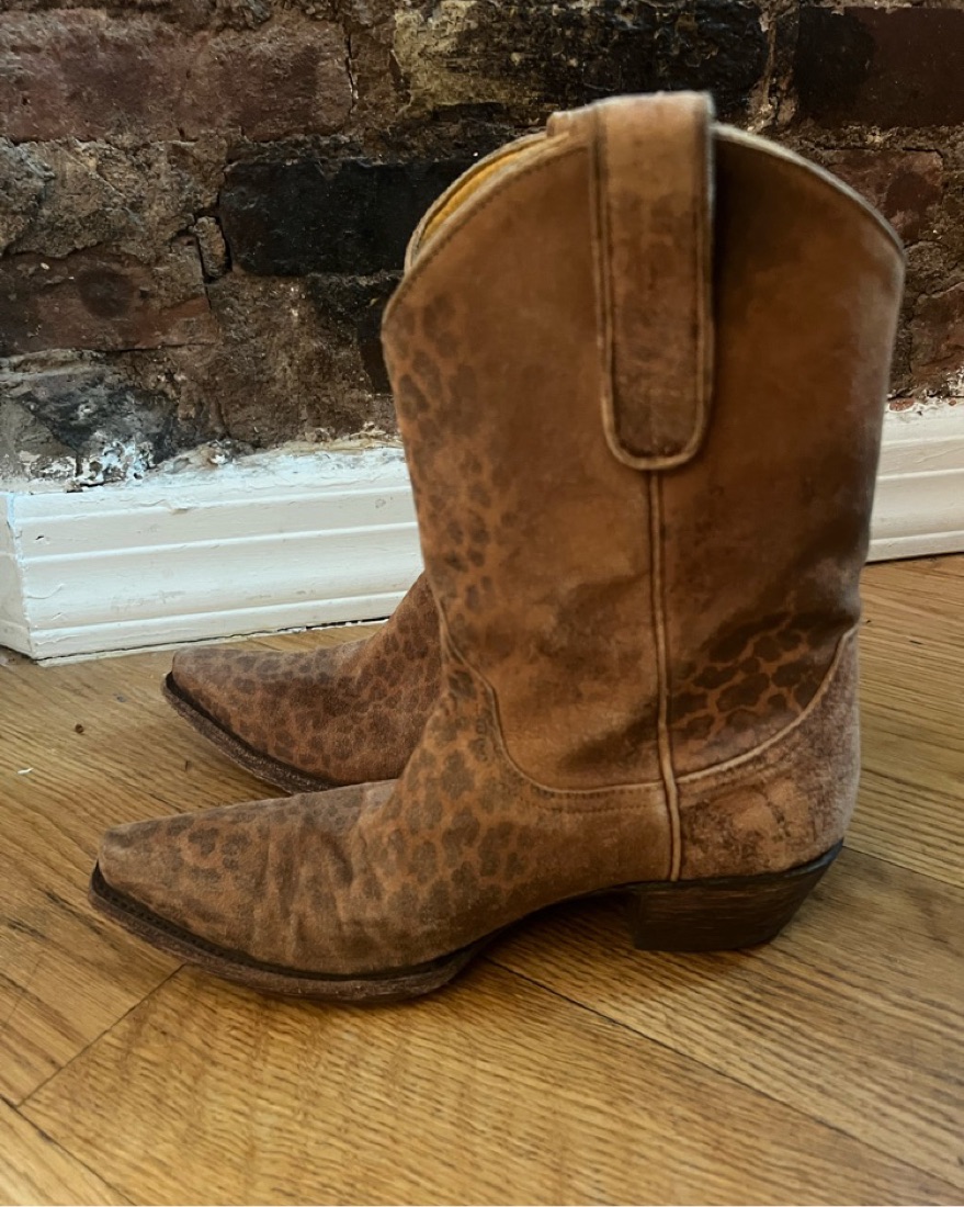 Shorter cowboy boots with faded leapord print. Authentic and amazing brand with average wear and tear!