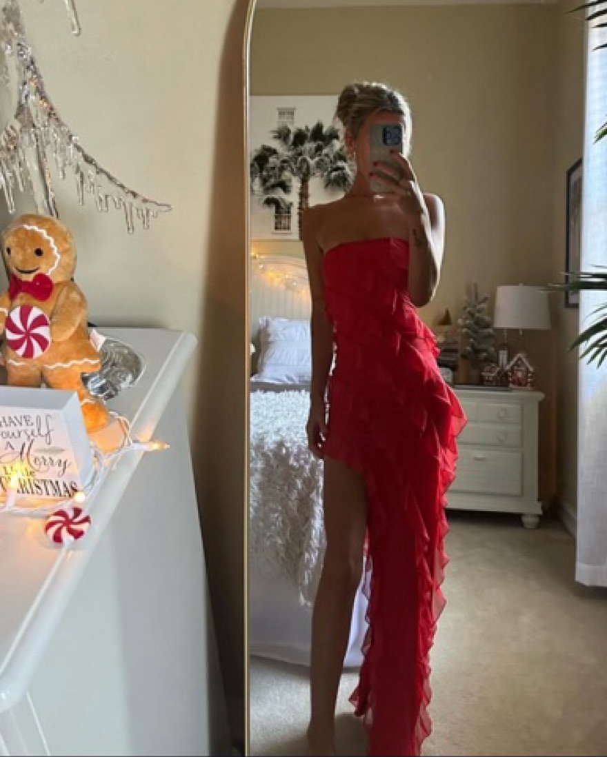 This stunning red ruffled gown is the perfect choice for a special occasion. Pair it with strappy heels and a clutch for a head-turning look.