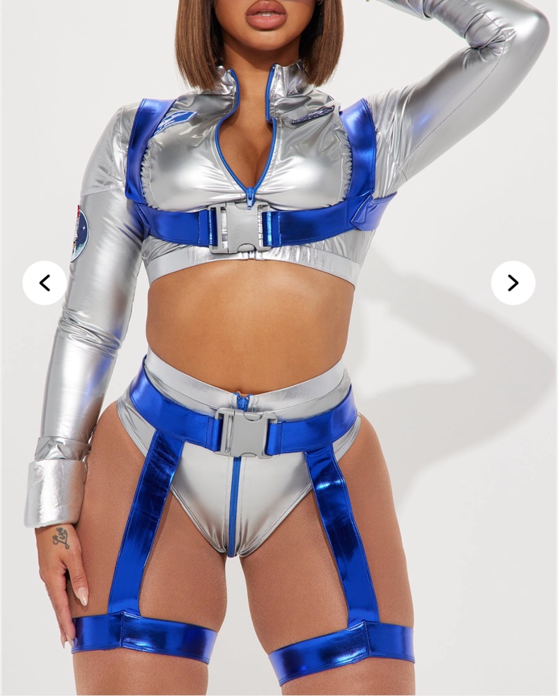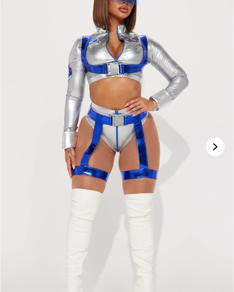 This eye-catching bodysuit set is perfect for a night out or a futuristic-themed event. The metallic fabric and sleek design create a bold, intergalactic look.