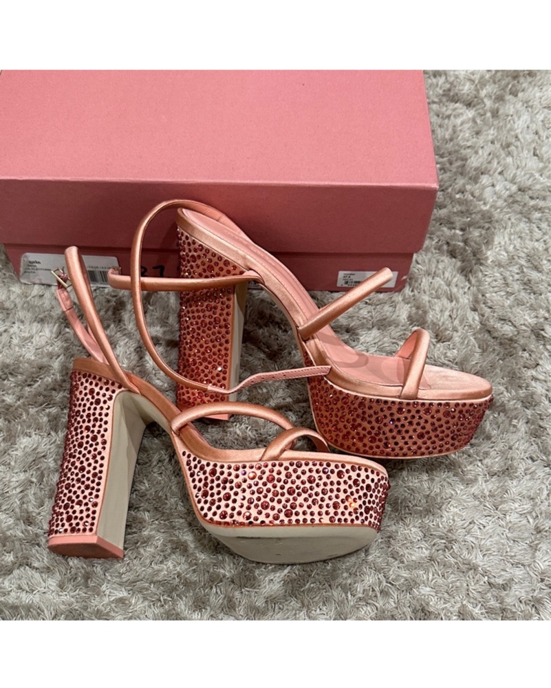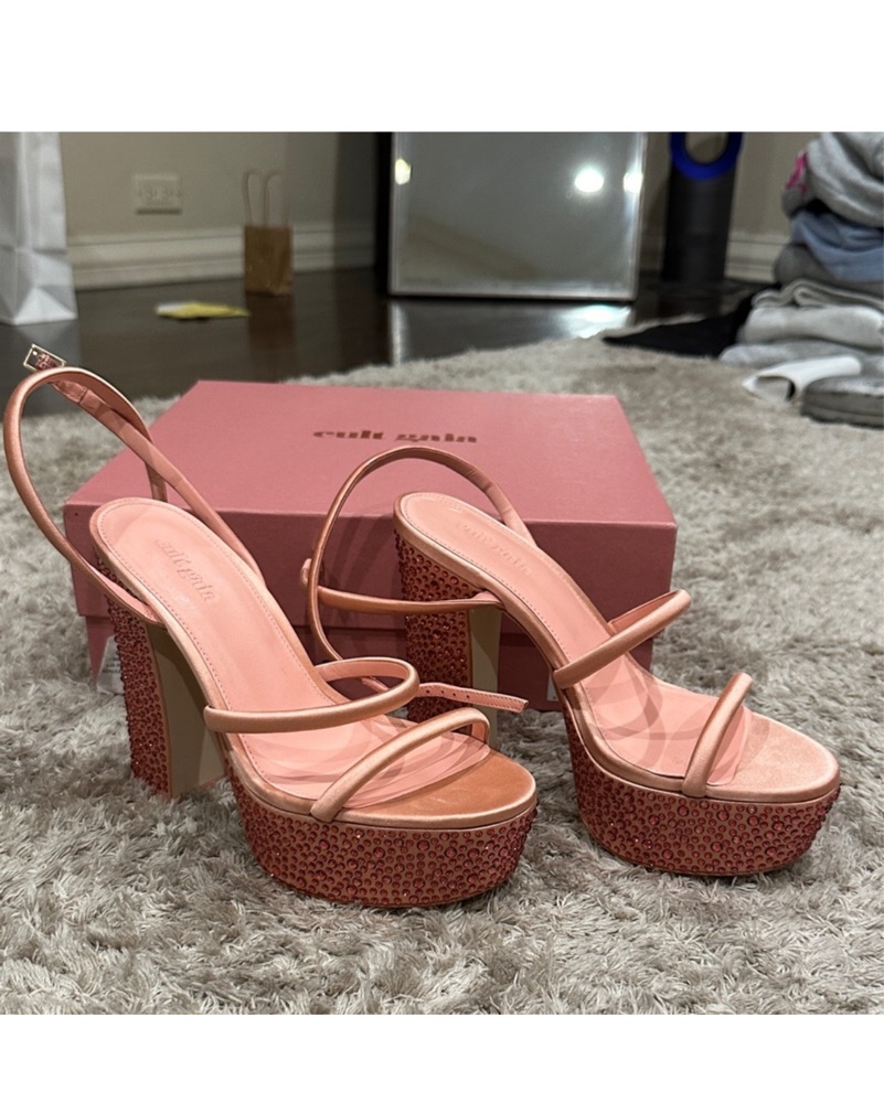 These eye-catching platform sandals are perfect for a night out on the town. The sparkling rhinestones add a touch of glamour, while the high block heel provides both style and comfort. Worn once
