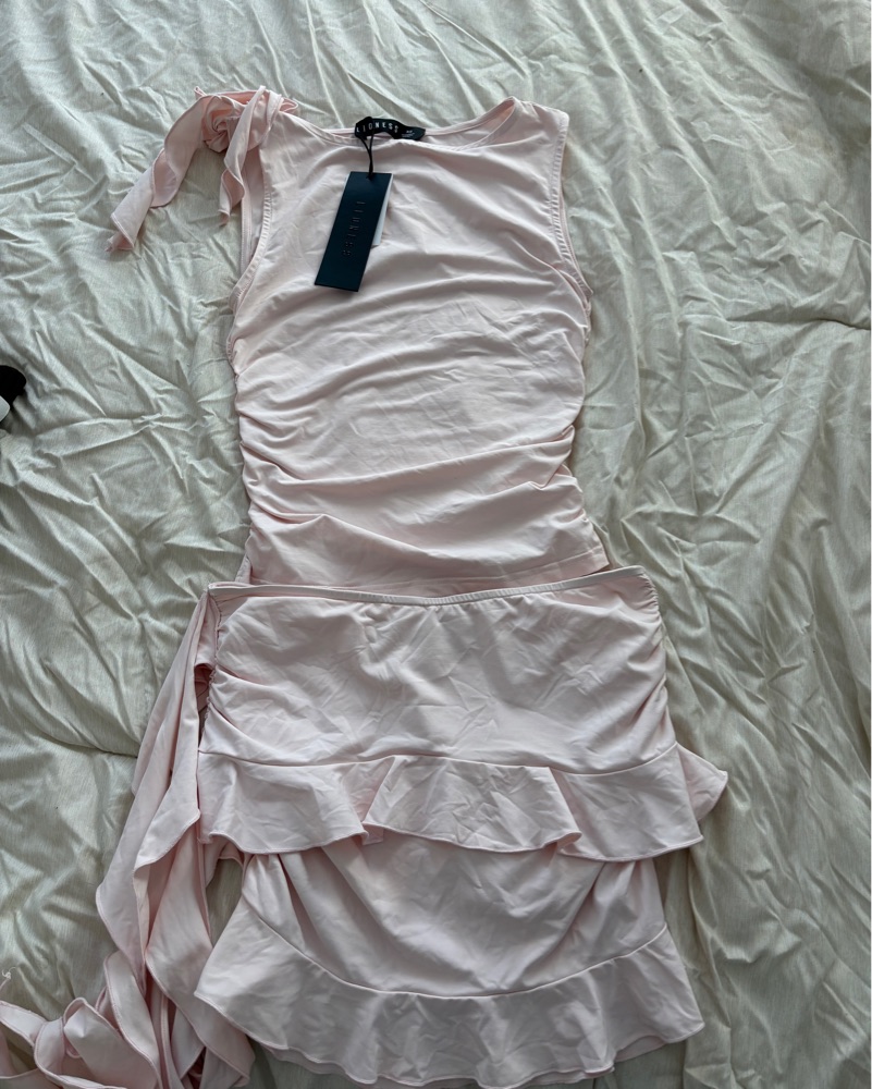 This feminine and flattering dress is perfect for special occasions. The delicate ruffles and ruching create a playful, flirty look that will elevate any event. Brand new, tags still on.