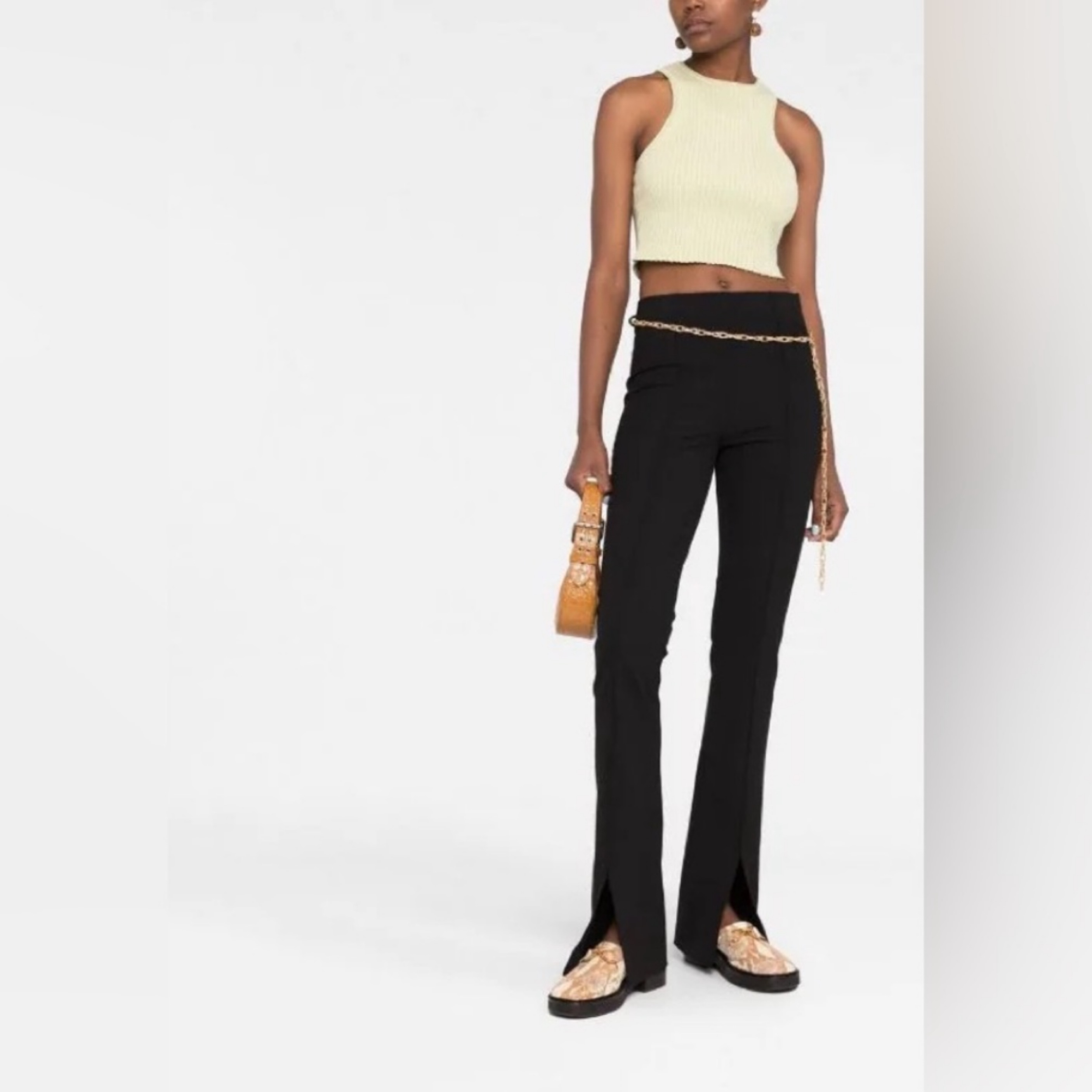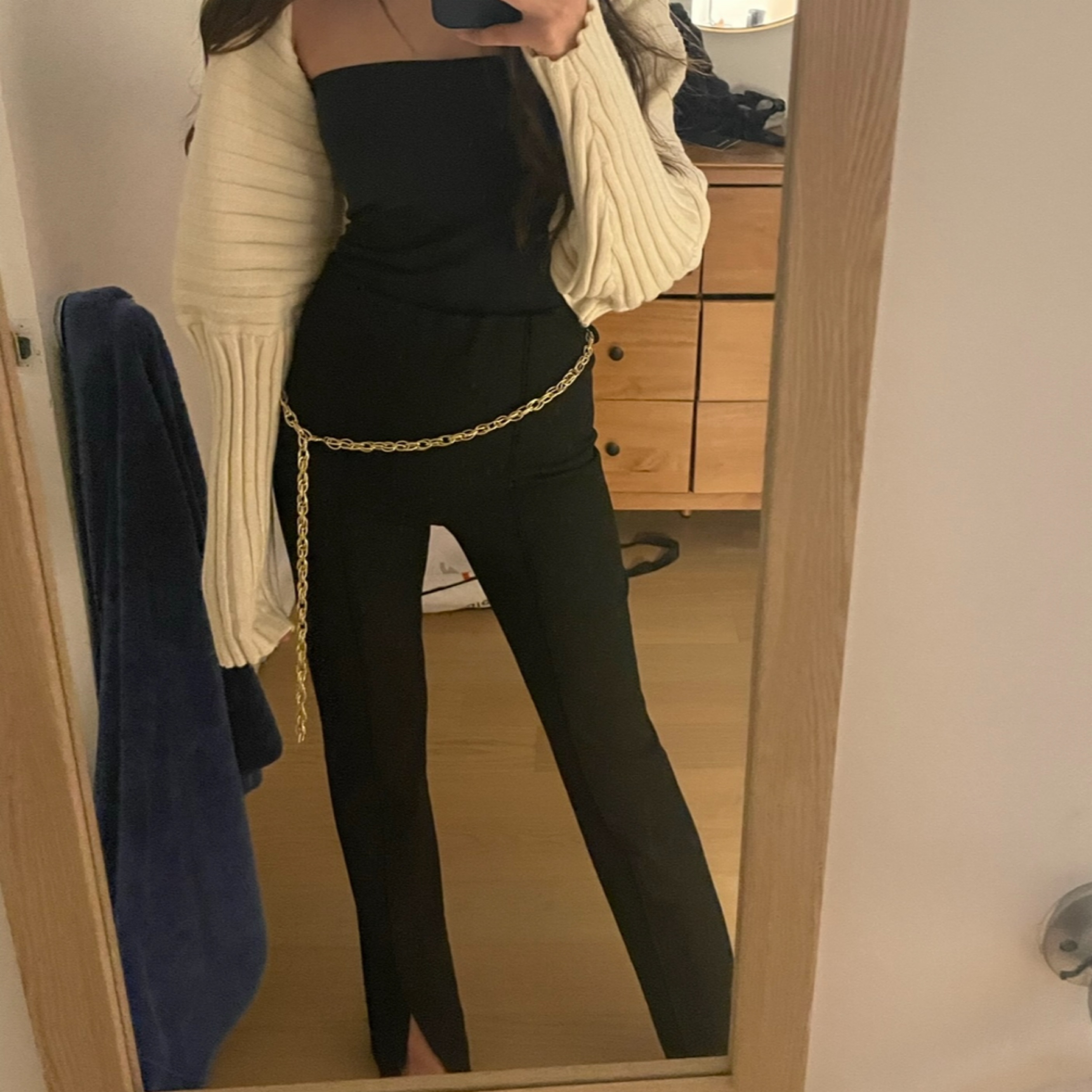 Size 34 (Fr), 0 (US). Super flattering high wasted pants, stretchy but sturdy marerial with split hem. Comes with adjustable, removable gold belt. Perfect condition- worn once!