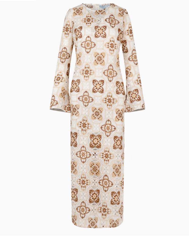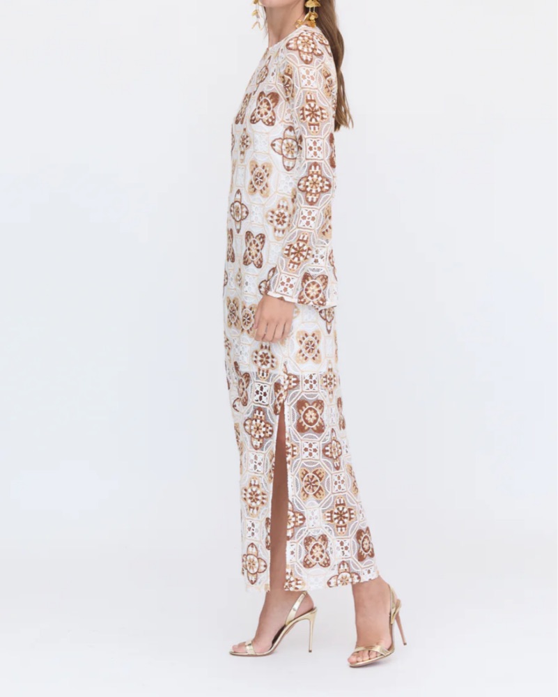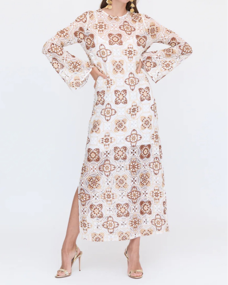 *no self tanner/spray tans please* A caftan-inspired silhouette, Eliza is a true maxi dress with long sleeves and a high neck. Subtle slits adorn either side of the maxi skirt for some added movement. Beautiful crochet fabric. White slip underneath can be removed to wear as a pool coverup