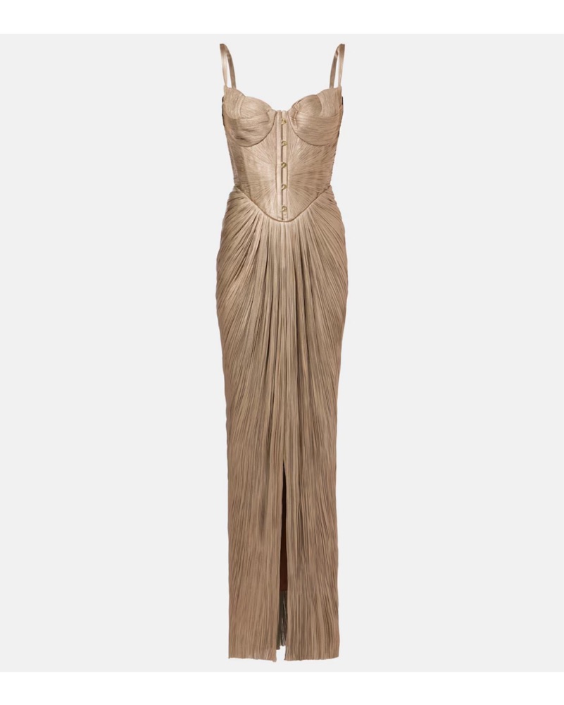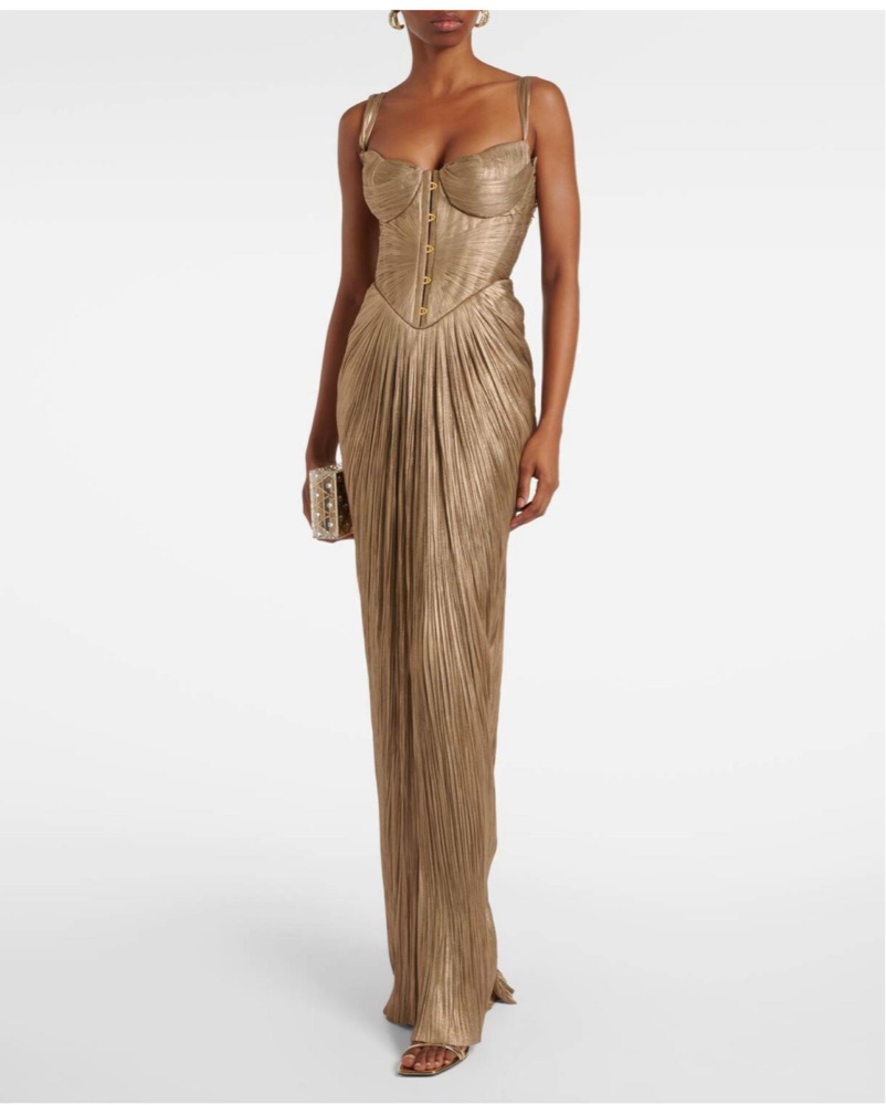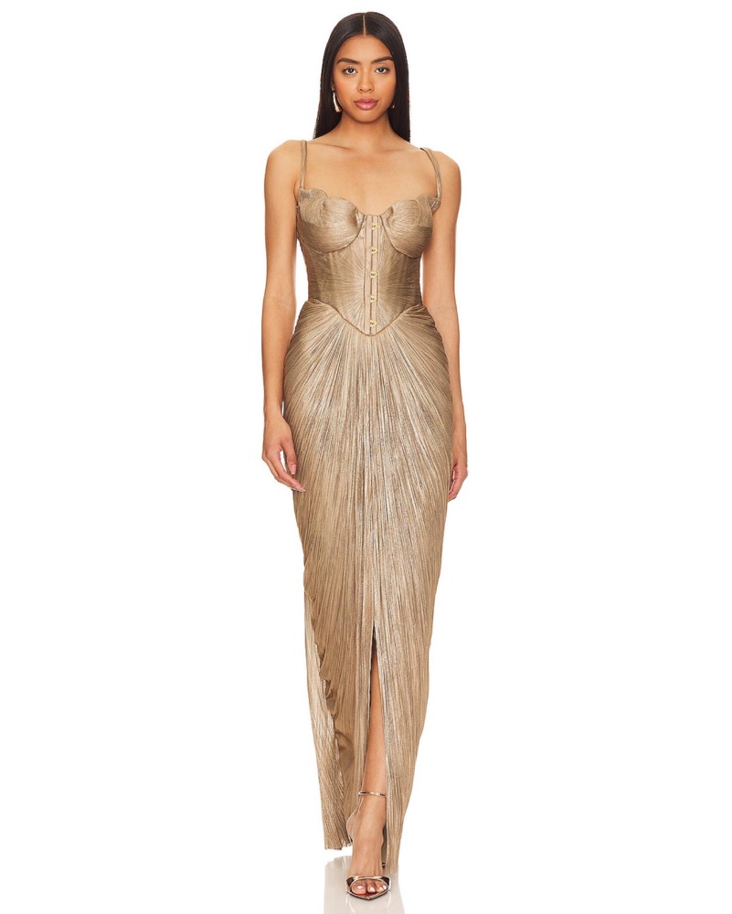Mint condition. Sold out everywhere. Size FR 34/US 2. Viral gold gown by MLH. Fits true to size - flexible fit with stretch in bust and adjustable corset. I am 5’10” and this is about an inch off the ground flat-footed. Shoulder seam to hem approx 60" in length. Very delicate must wear with care!