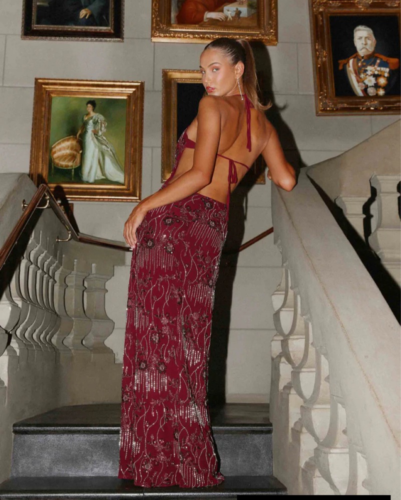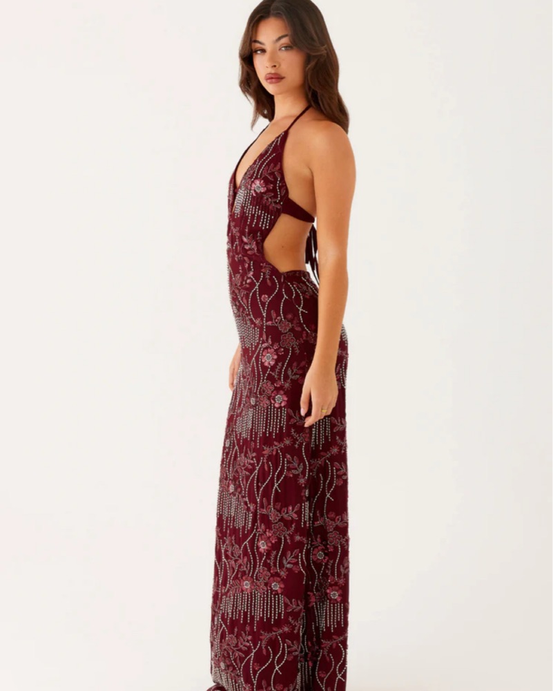 never worn! tags still on. beautiful burgundy beaded dress from peppermayo. - V neckline