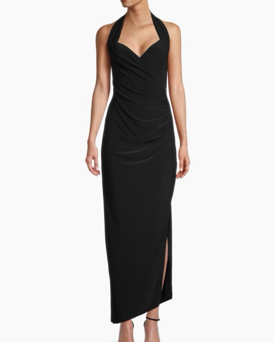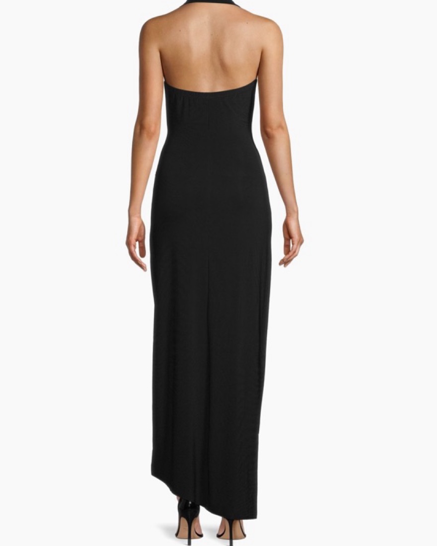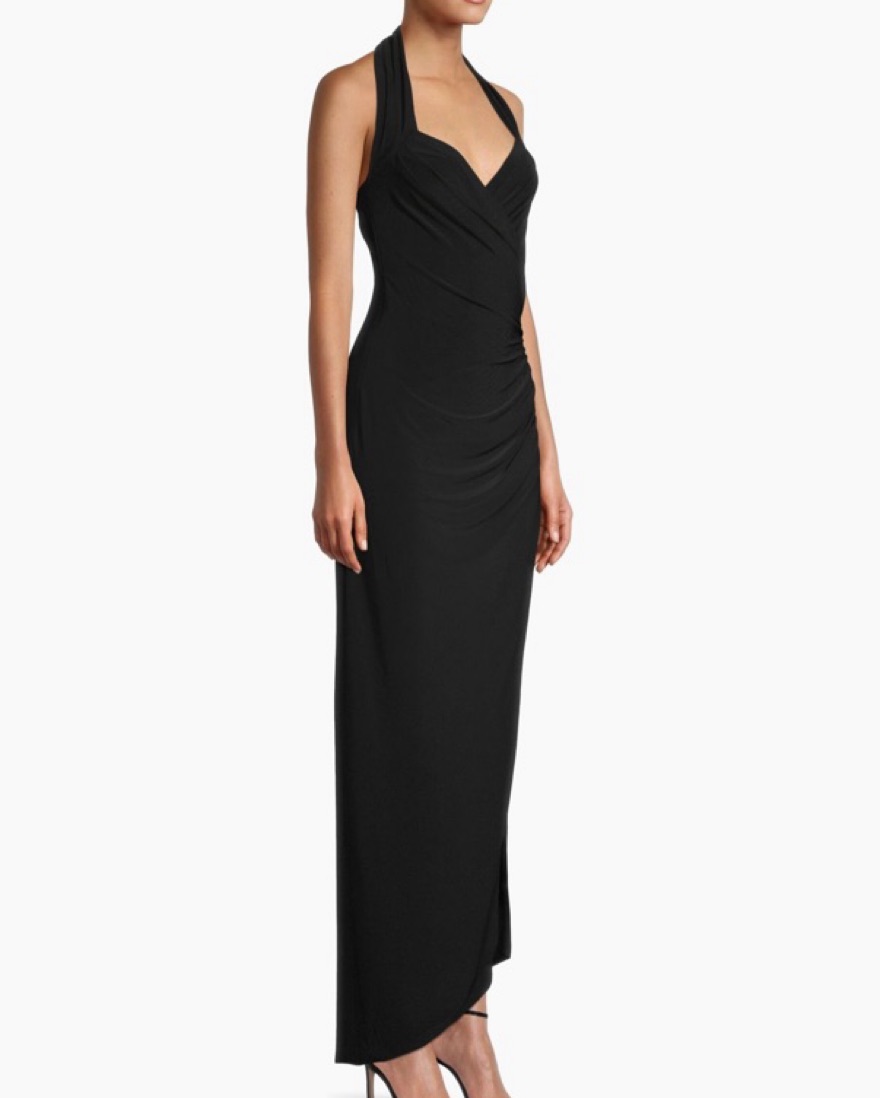 Norma Kamali halter black gown. This style is sold out online! Perfect for a black tie wedding or gala. Super flattering!! Usually wear a small but fabric is very stretchy and XS fit better. Not wearing a bra in these photos.