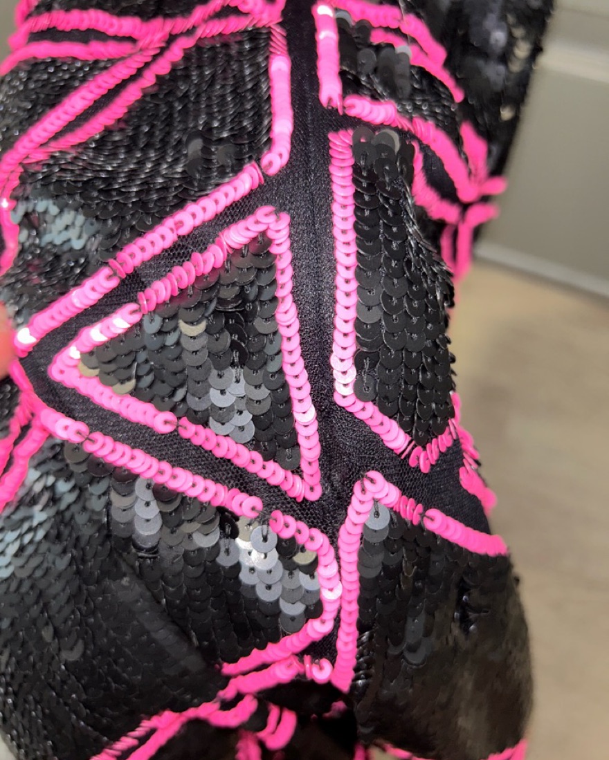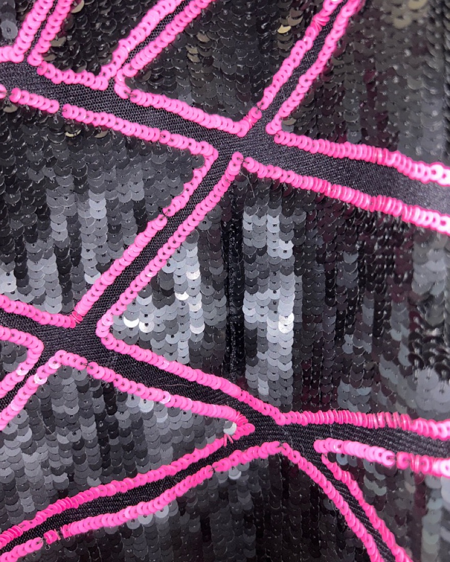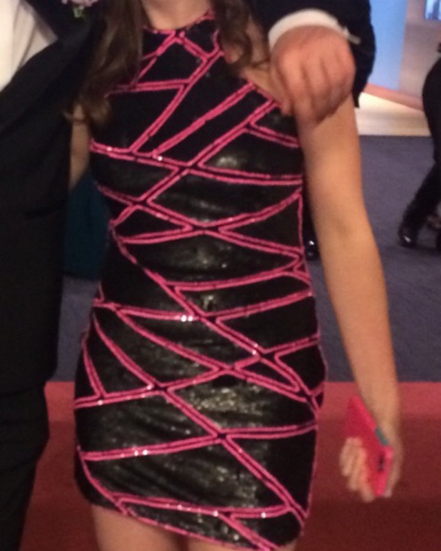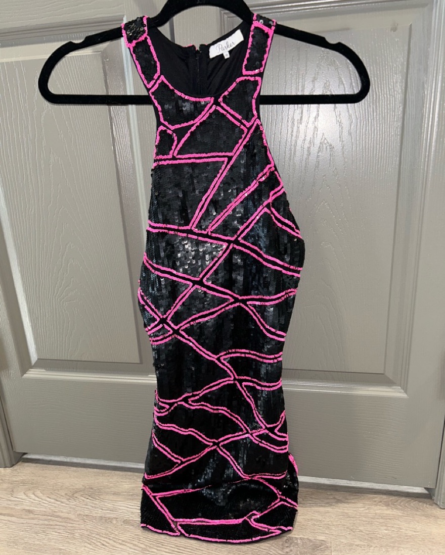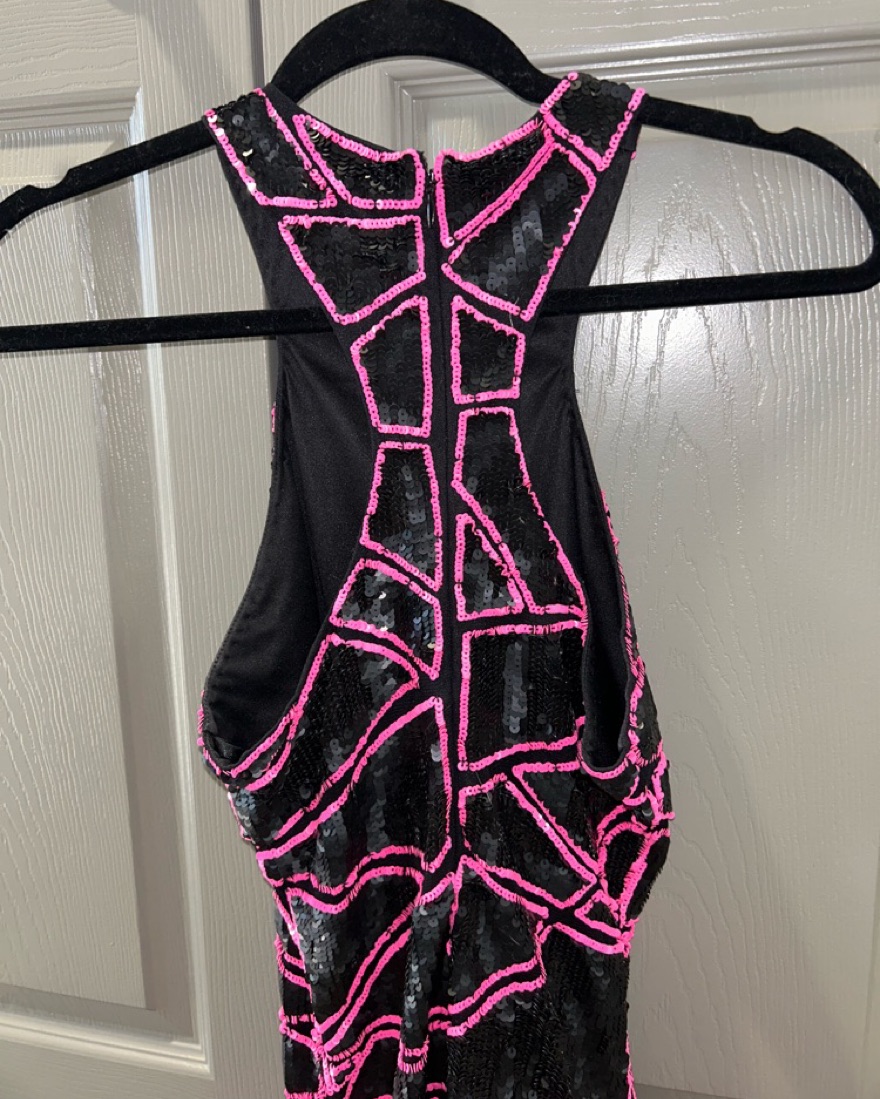 This would be great for new years eve! Super fun pink and black sequin mini dress! Tiny pull on the front, it's pictured here and barely noticeable!