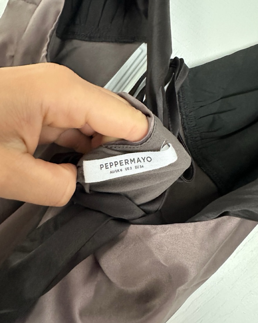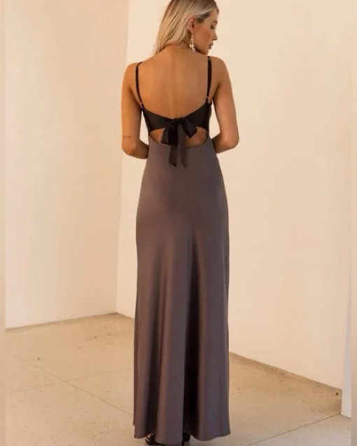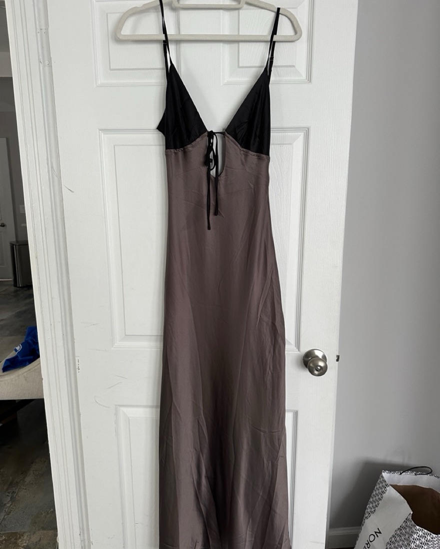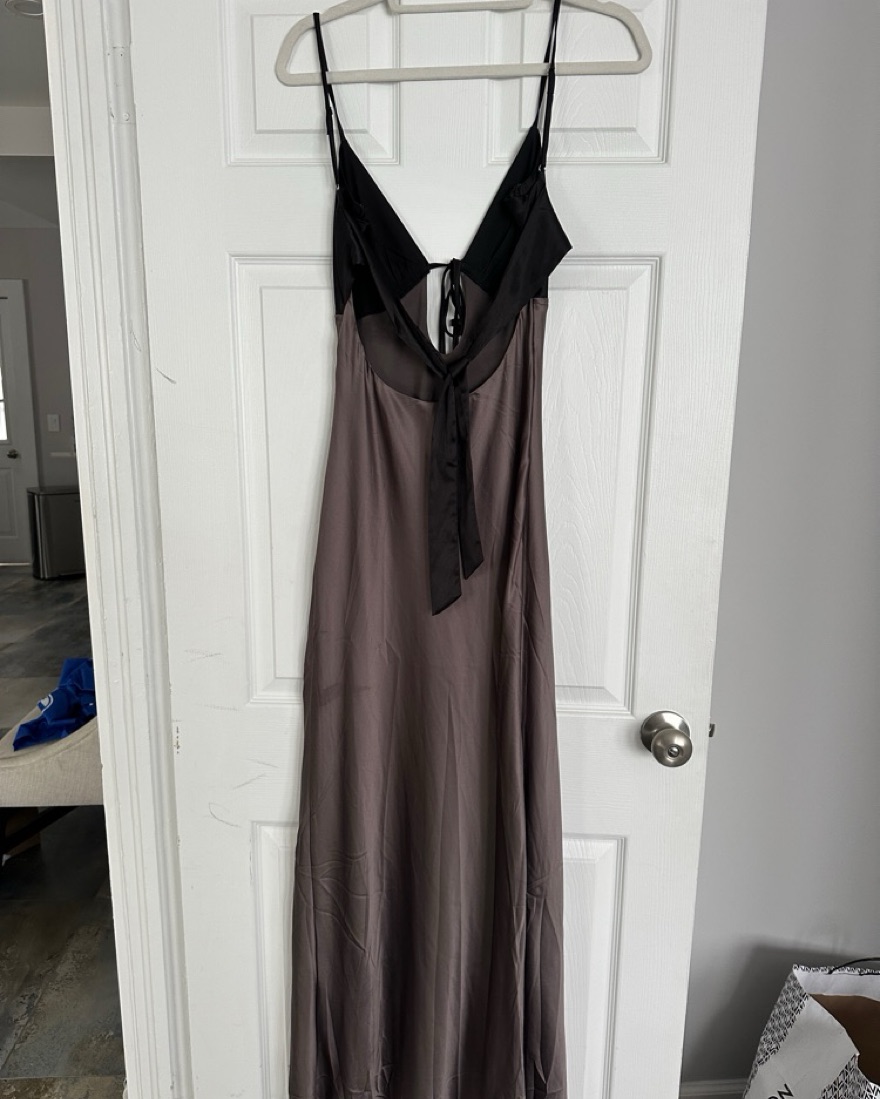 Maxi dress in color steel me away. Like a dark gray/silver or gunmetal and black combo. Ties in front and back. Adjustable straps