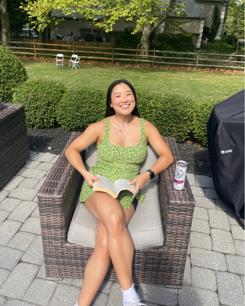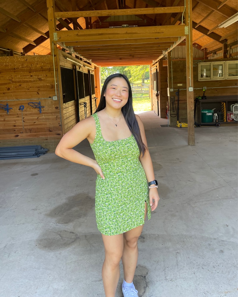 Mini Noha dress in Samantha - green floral. Sleeveless. Back zip closure. Front slide slit. Unlined. Lightweight. Boho/colorful/feminine style