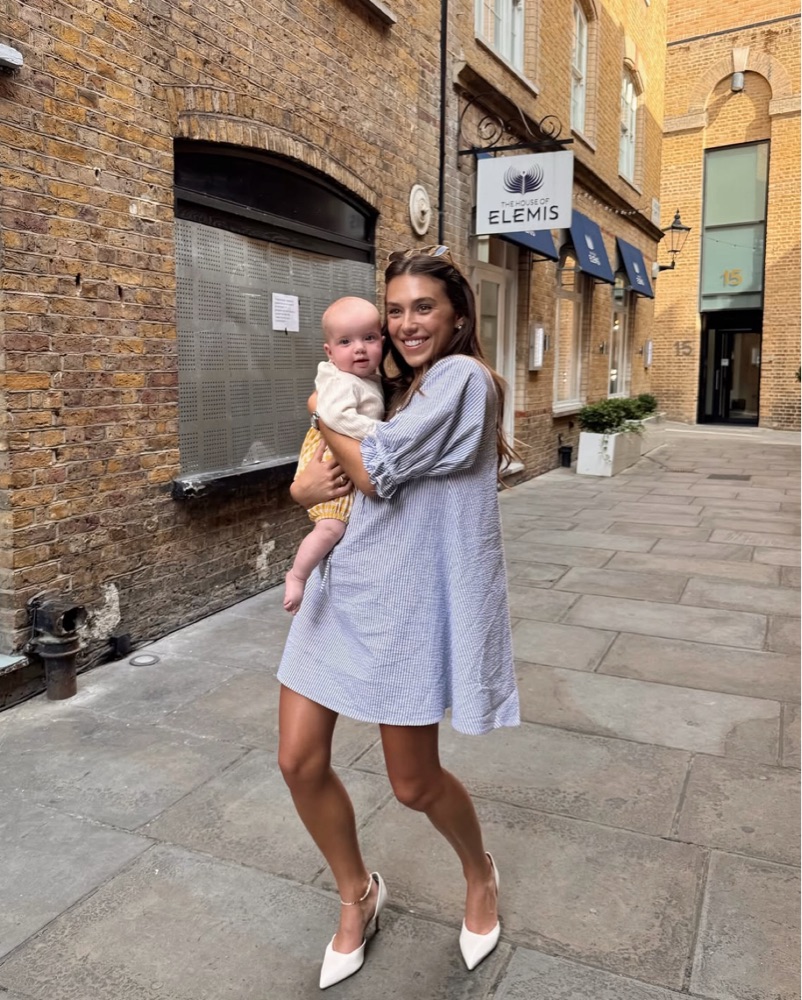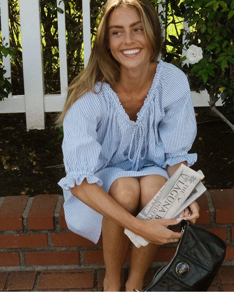 Blue and White Seer Sucker dress from Merritt Charles, sold out as seen on Ella Rose🌹 dress is to die for on, perfect for European summer, bachelorette, beach trip, date night, etc from Merritt Charles brand that’s not on pickle