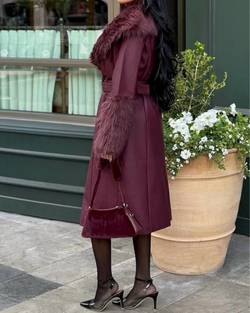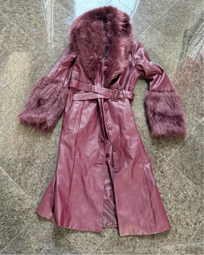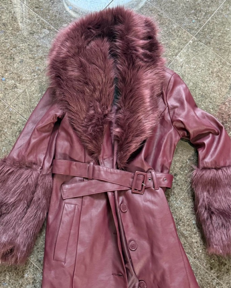 Burgundy faux fur leather trench coat with belt, Fashion Nova Nights in Paris #fauxfur #trenchcoat (brand new, tag on)