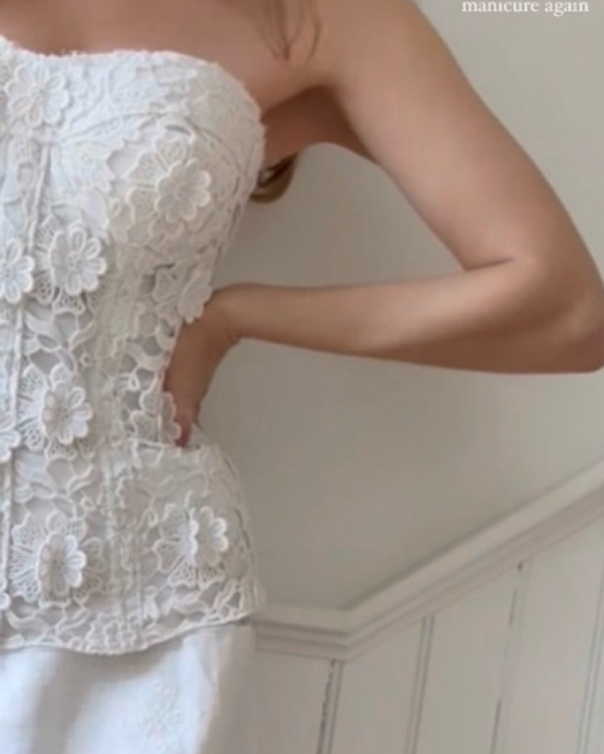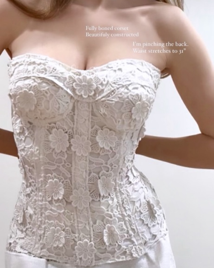 White lace, crocheted vintage dolce & gabbana corset. It is lace up, but it also has a zipper 💕 currently would best fit an XS- M Because of the lace up. I am a true extra small and lace it all the way tight. But it can be opened and inside looser up to a medium