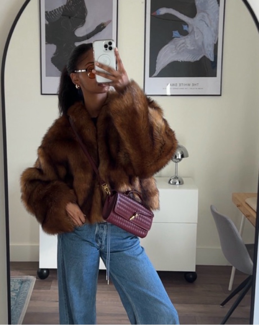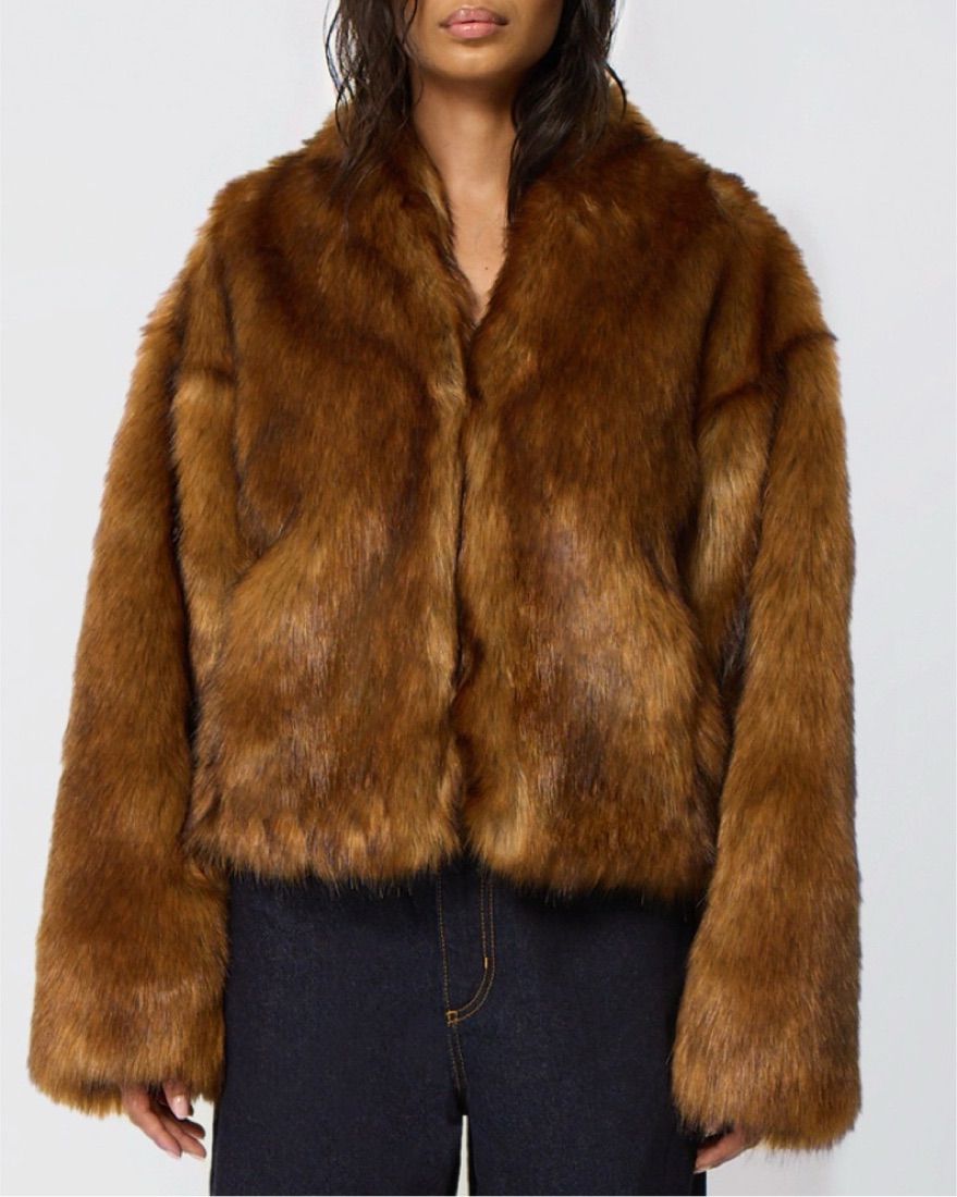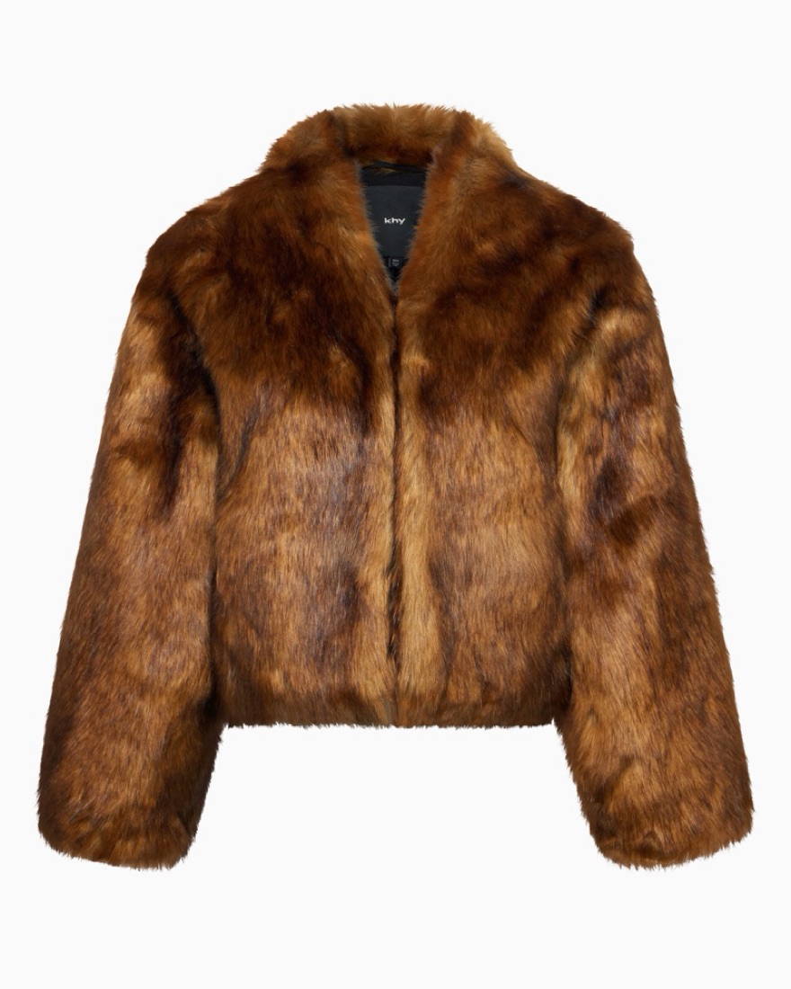 THIS IS A SHORT FAUX FUR JACKET WITH A BOXY, OVERSIZED FIT AND A NARROW SHAWL COLLAR NECKLINE. MADE FROM A HEAVYWEIGHT, MULTI-DIMENSIONAL FAUX FUR.