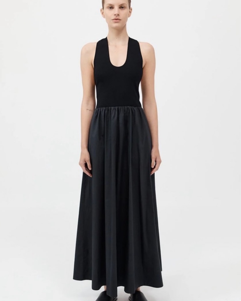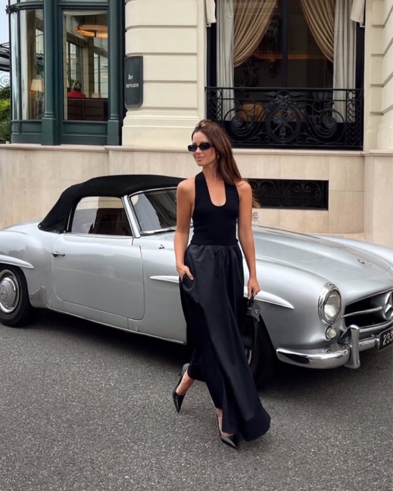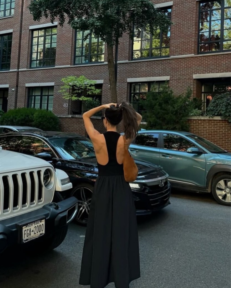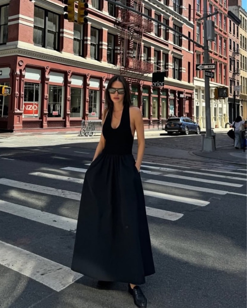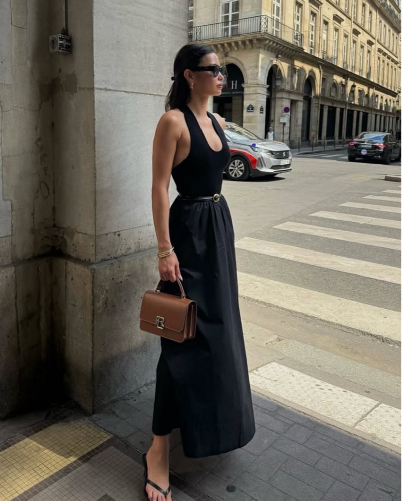 This sleek and sophisticated black maxi dress is perfect for a formal event or elegant evening out. The flowing skirt and backless design create a sophisticated and modern look.