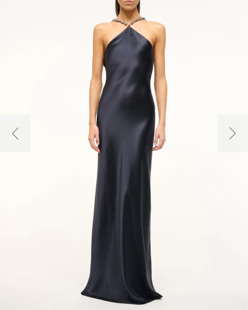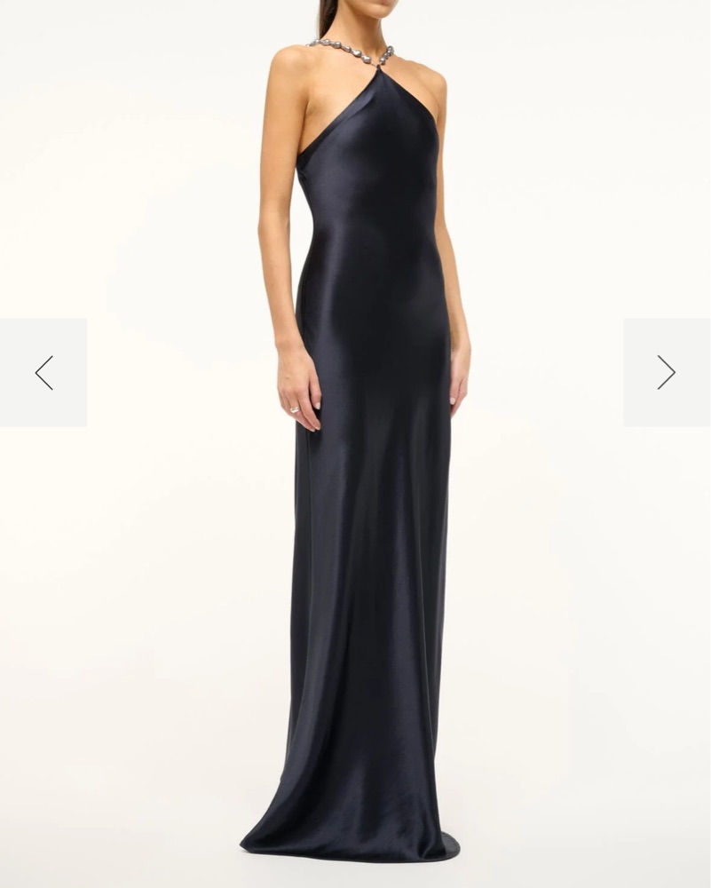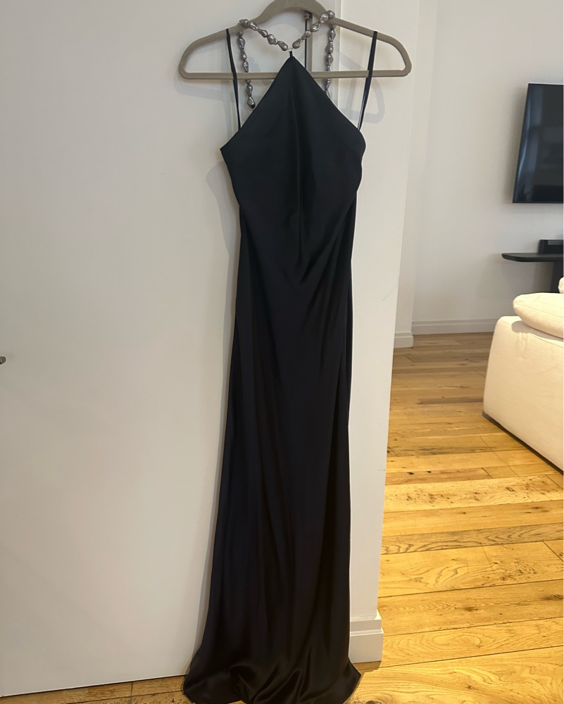 This stunning satin gown with a halter neckline is perfect for a formal event or special occasion. The sleek, flowing silhouette creates a glamorous look.