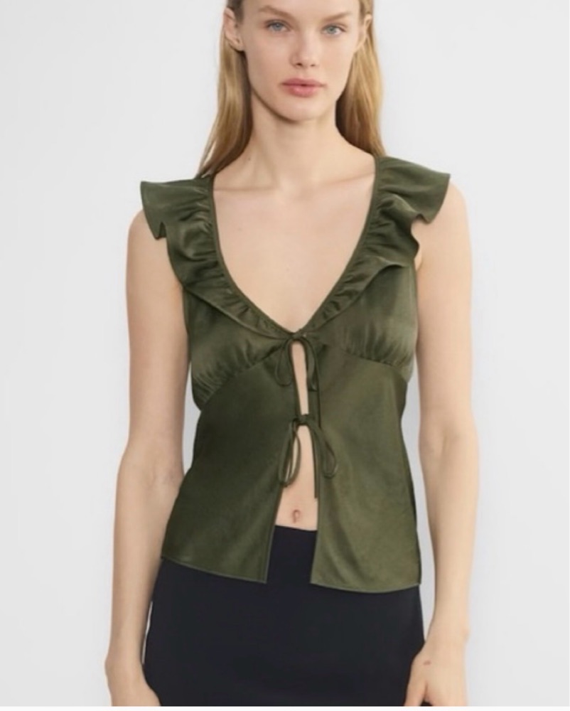 This stylish olive green top features a flattering ruffle neckline and tie detailing, perfect for a chic day-to-night look.