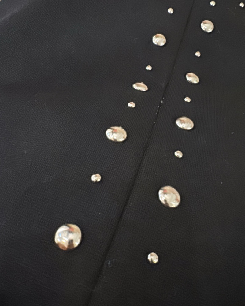 This sleek black dress features a structured bodice with eye-catching stud detailing. It's the perfect piece for a formal event or night out on the town.
