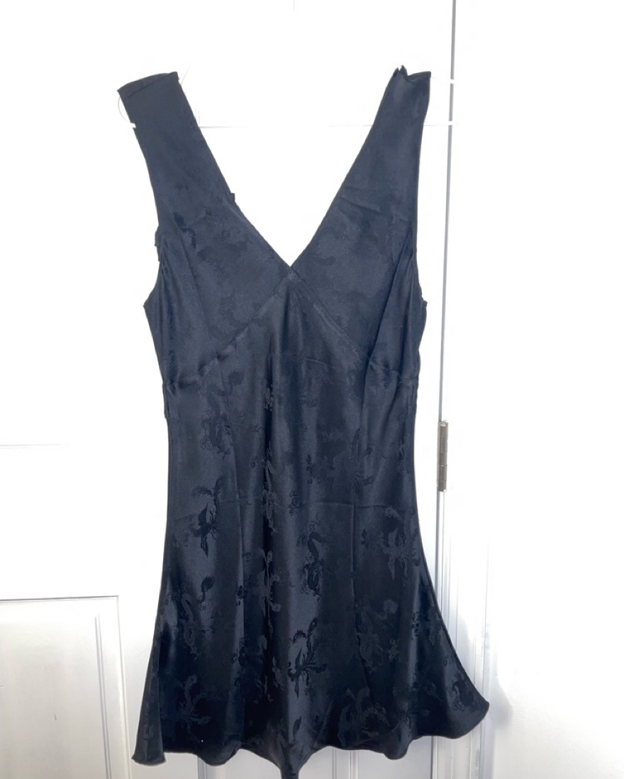100% silk mini dress. marked a size M but could also fit a Small! it is pretty short though so if you’re on the taller side or have a fuller bum, just know it is going to be pretty short in the back! super cute with tall boots for going out. as seen on olivia rodrigo ;)