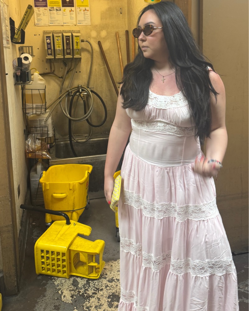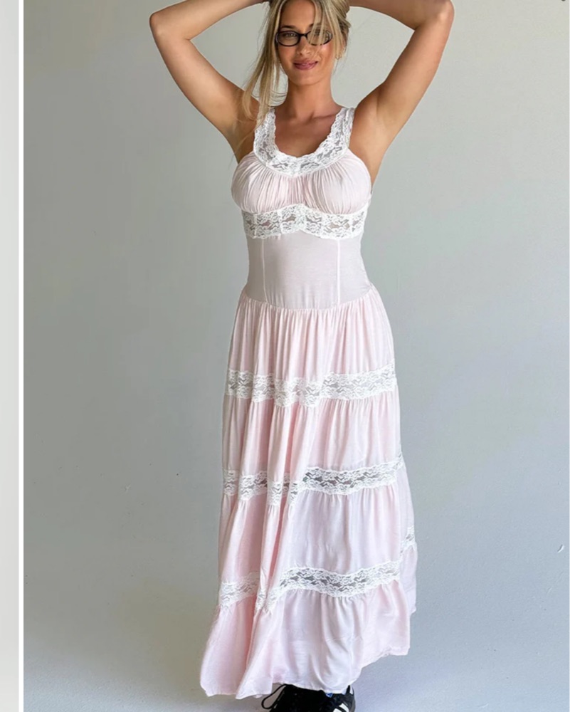 Frankie’s bikinis pink Dakota dress size small, got hemmed to fit petite girlies (I’m 5’0 and it goes below my ankles)