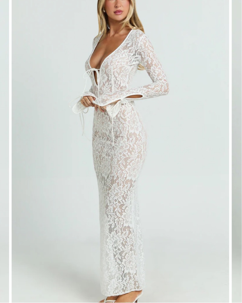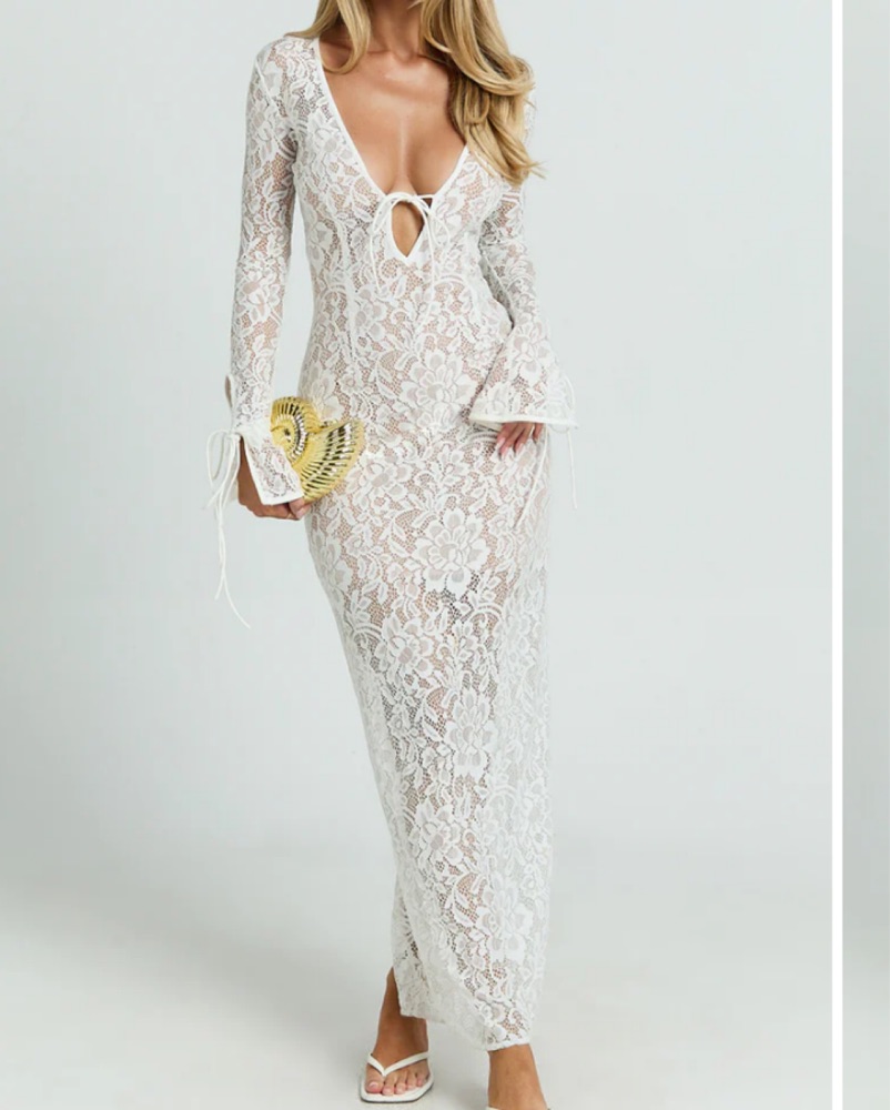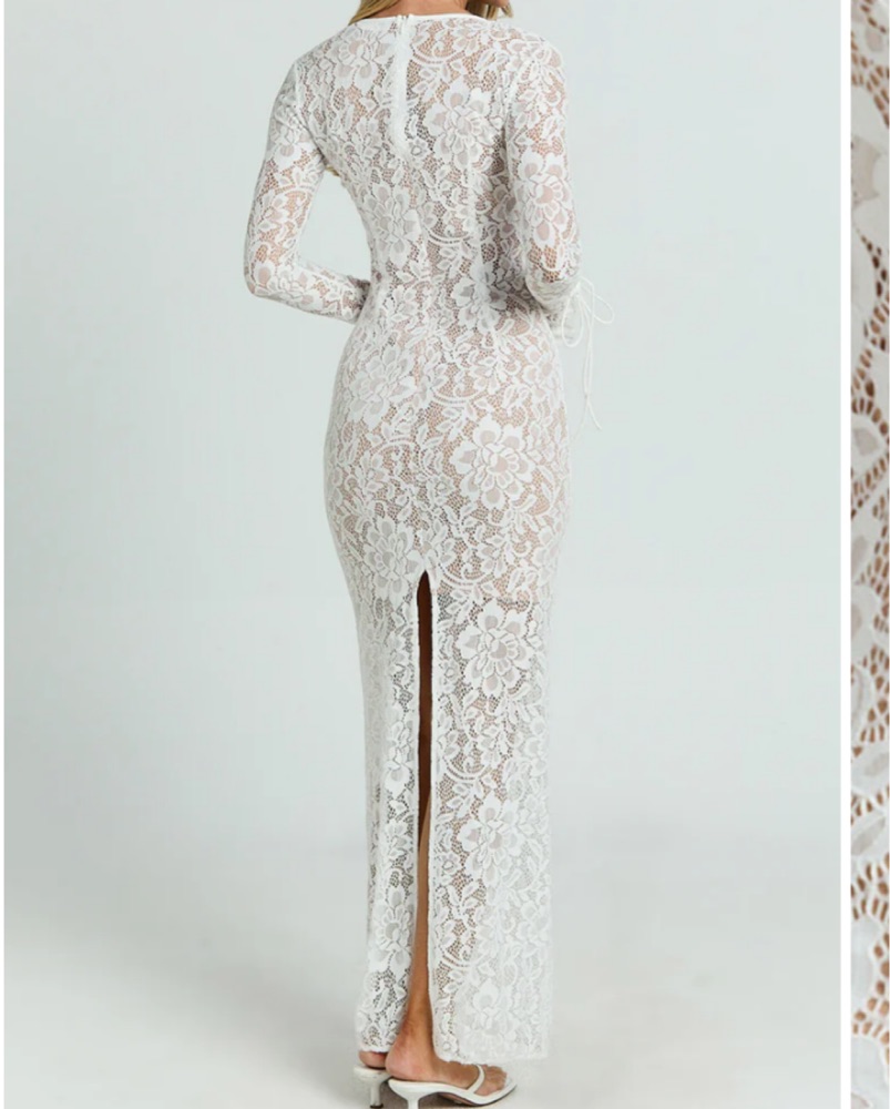 This stunning lace maxi dress is perfect for a formal event or special occasion esp anything bridal!! The long sleeves and ties add a touch of elegant sophistication. Only wore once for a few hours! So comfortable and flattering! Must dry- clean before returning.