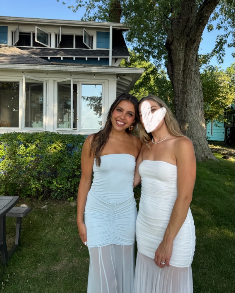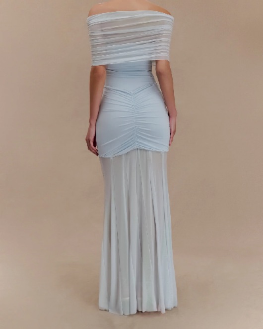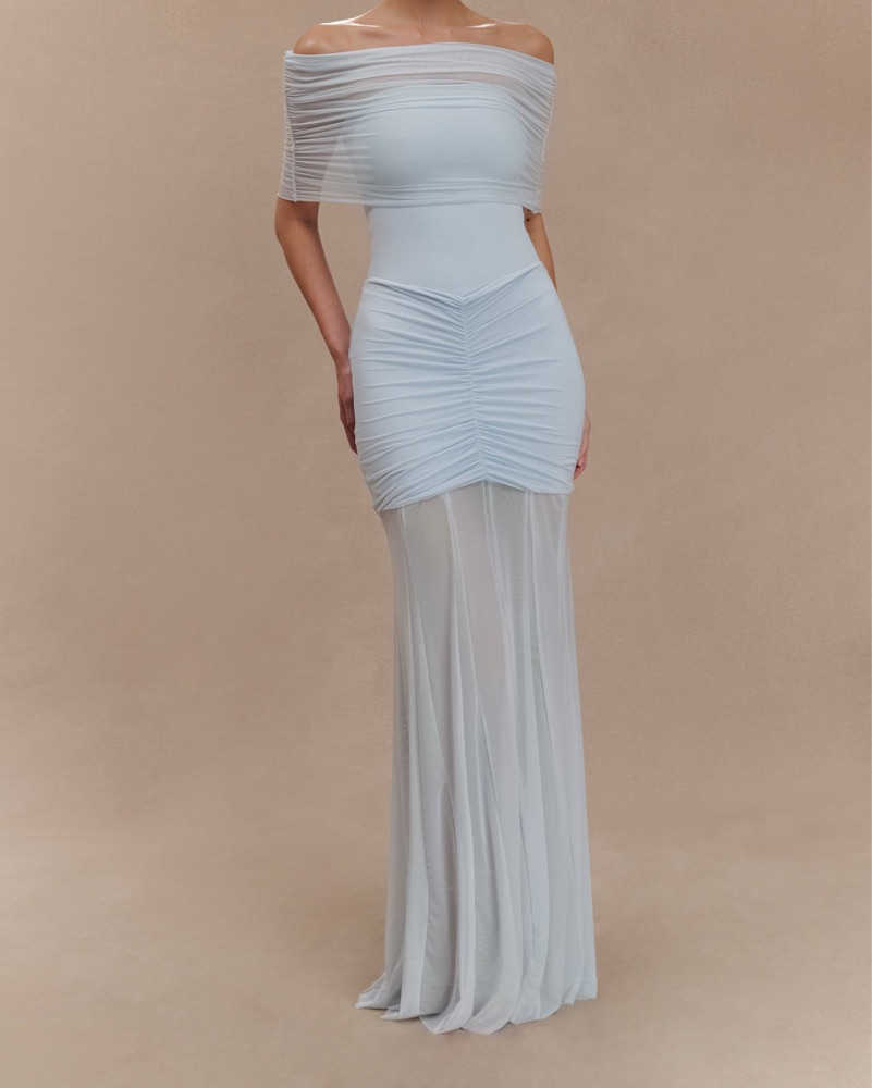 Meshki Caspian Slinky & Mesh Off Shoulder Maxi Dress in Pale Blue. Floor-length stret gown with detachable mesh off-shoulder overlay, ruched waist detail, and strapless fitted bodice. The icy blue color is perfect for wedding guest, black tie, formal event, gala, prom, or cocktail party.