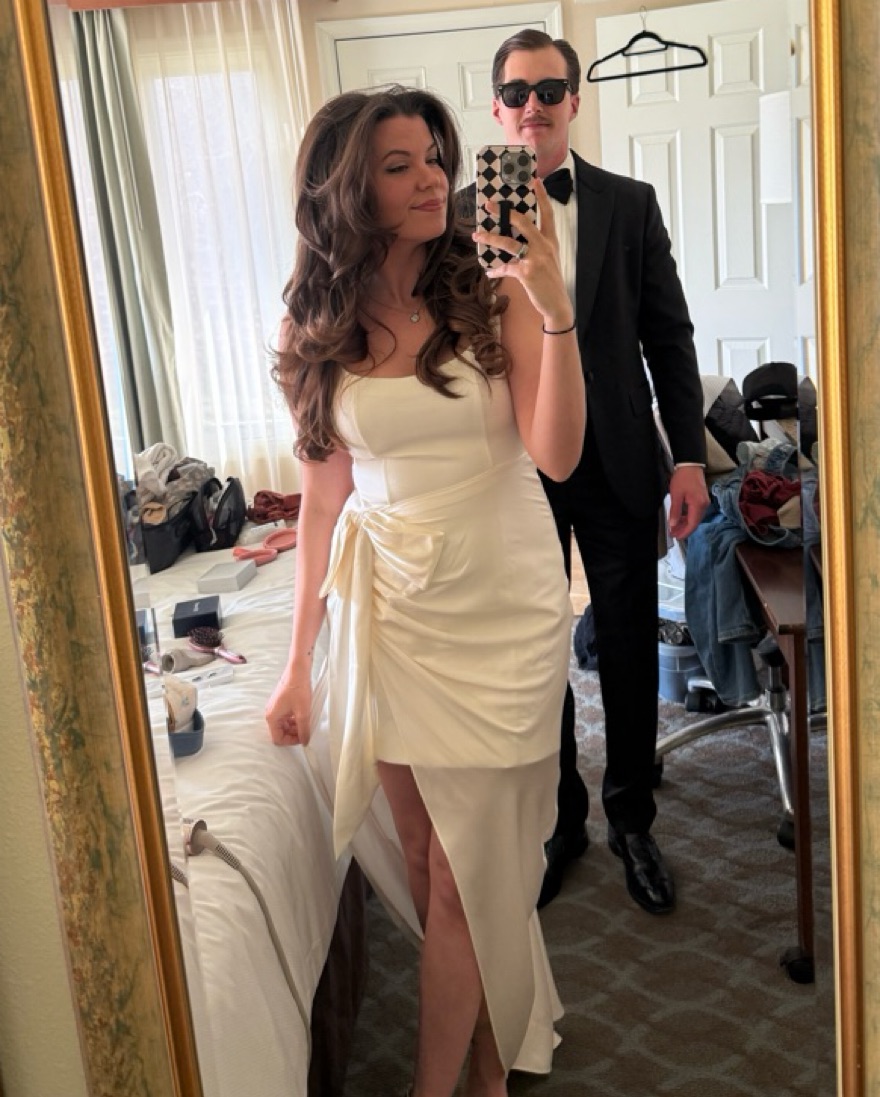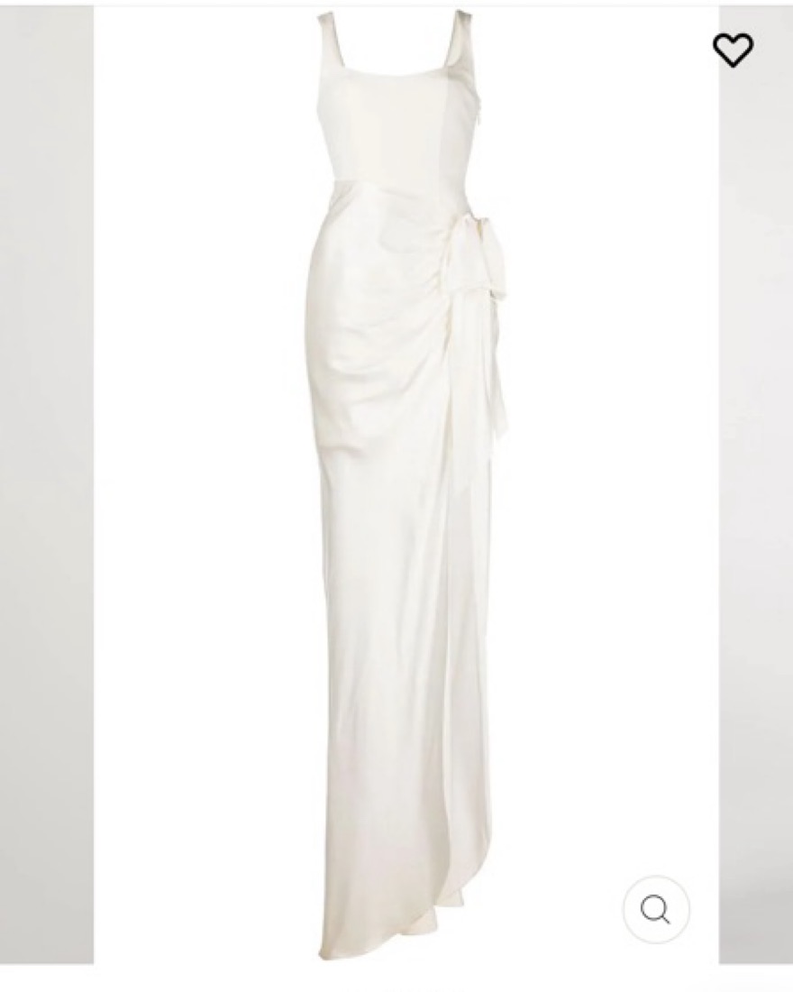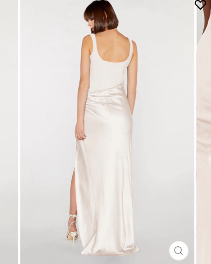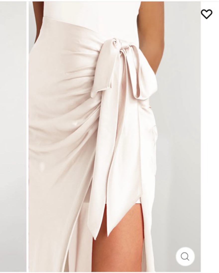 Sleeveless wrap gown with silk detail. The bodice is white and the skirt is barely cream. Fits size 6 like a glove! NOTE: There is a slight train!