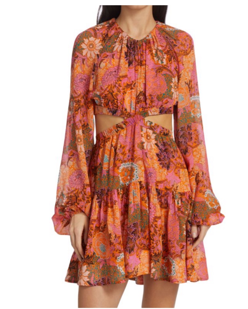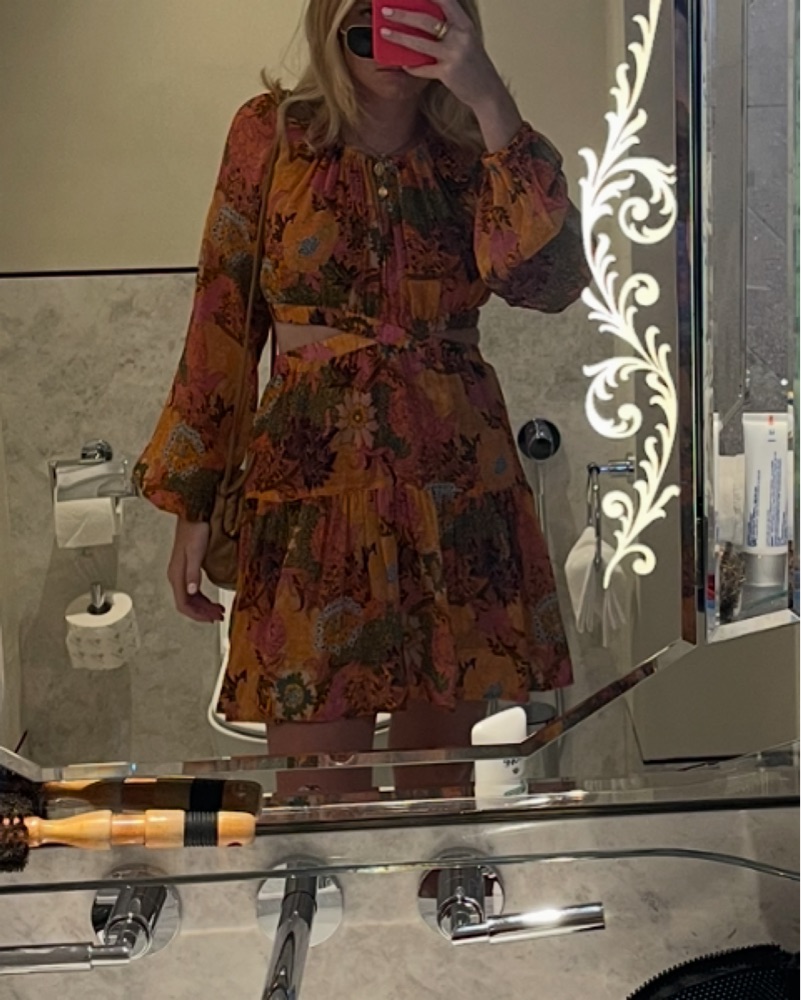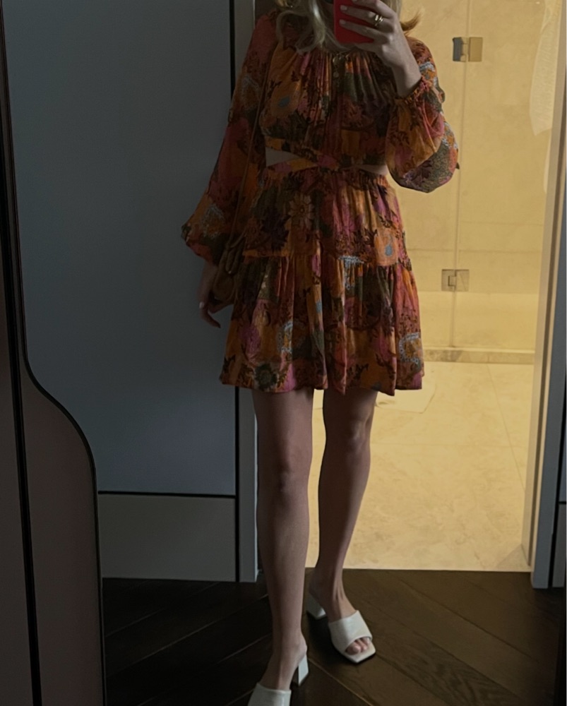 This stunning floral midi dress is perfect for a summer garden party or casual wedding. The vibrant colors and playful tiered design make it a showstopping choice. Not tailored, stretch material on waist, I am 5’6”