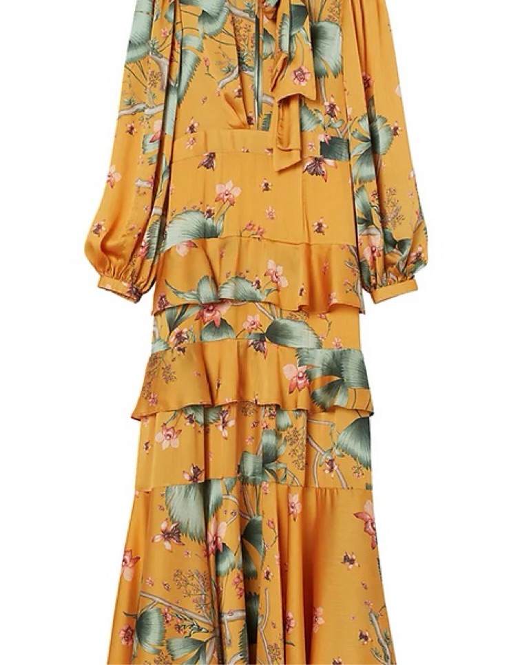 JOHANNA ORTIZ x H&M Long dress in a patterned, crinkled weave with a slight sheen. Scarf collar, draping at the back with covered buttons at the back of the neck, an opening front and back and long puff sleeves with elastication and covered buttons at the cuffs.