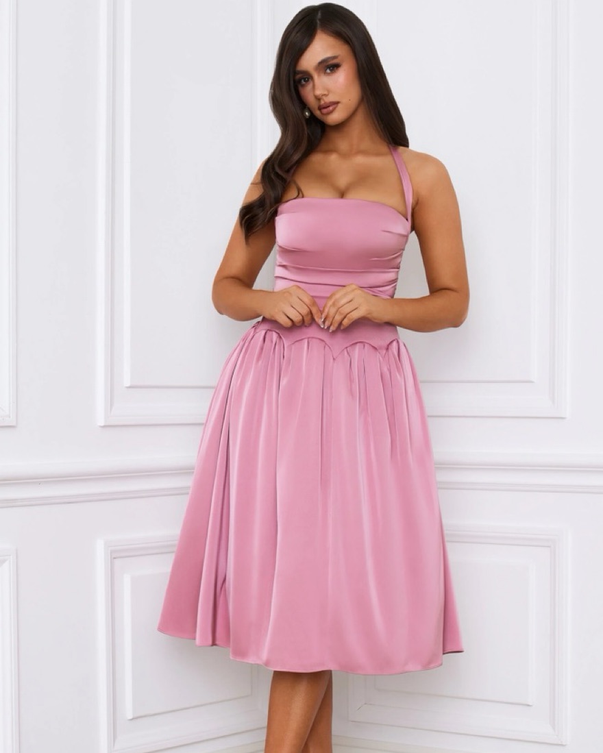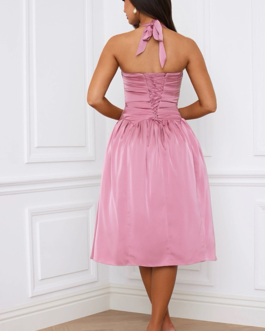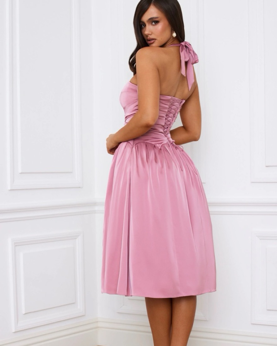 This midi dress is crafted to a timeless halterneck silhouette and cut from sumptuous lightweight satin with a stretchy tulle and mesh lining for enhanced volume through the skirt. It features a built-in corset for enhanced shaping and a lace-up back.
