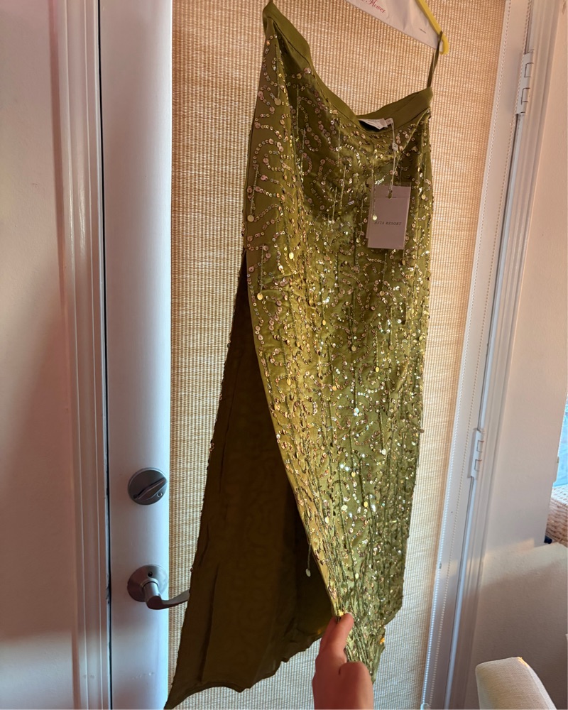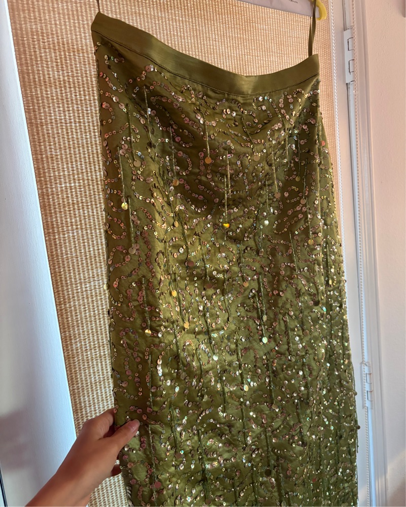 This stunning olive green sequin skirt (no top!) is perfect for a glamorous evening event. The figure-flattering silhouette and eye-catching sequins will have you shining bright on the dance floor. Tags says S but fits like a true M.