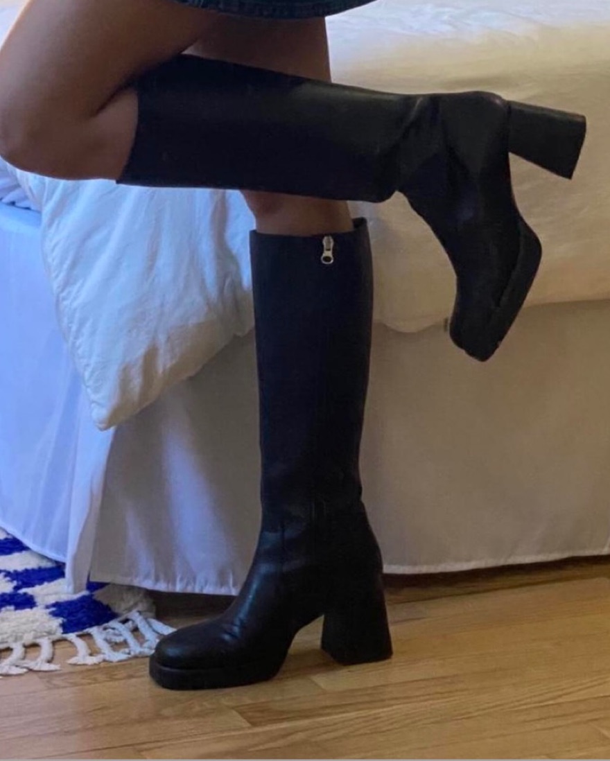 Black leather knee high boots! The boots are fitted through the calf and have a chunky heel that’s super comfortable to walk in. Super cute and perfect to wear with a short skirt or dress