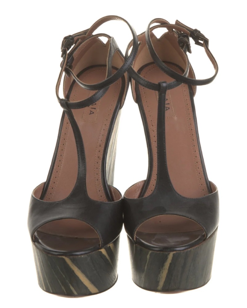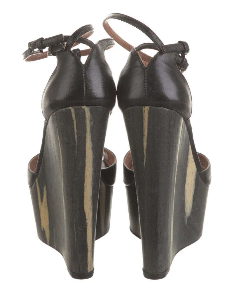 Black leather t-strap peep toe heel with marbled wooden platform wedge. Features double buckle closure. As seen on Jessica Simpson! US 6.