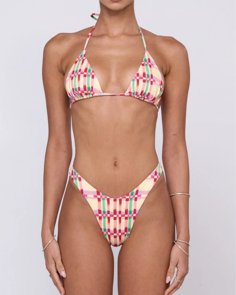 top: kyle bikini top (triangle) | bottom: joey bikini bottom (cheeky) | tan, pink, red, green plaid | see other listings for coverup shorts and matching skirt set