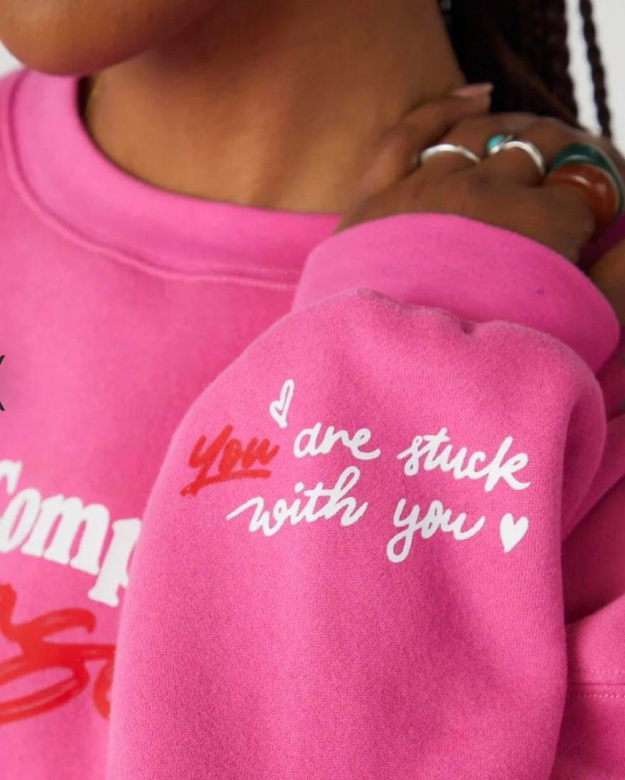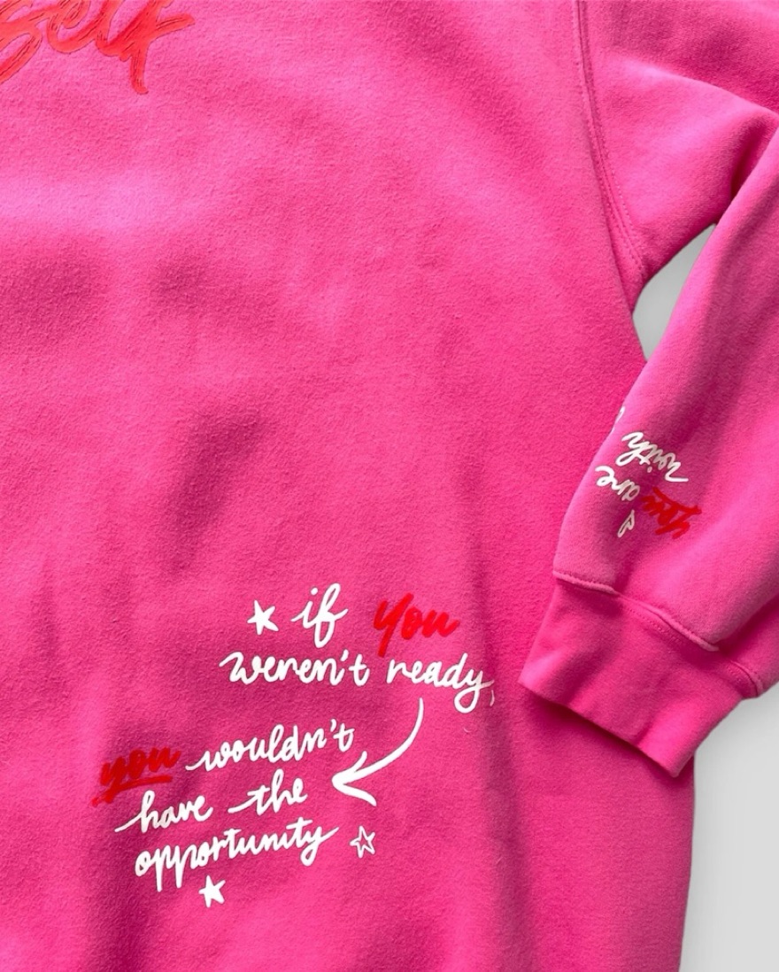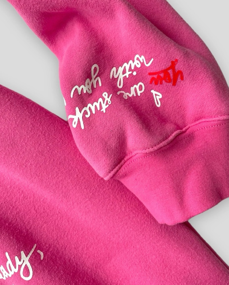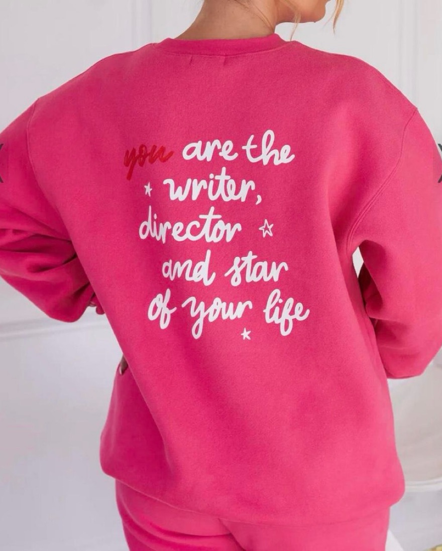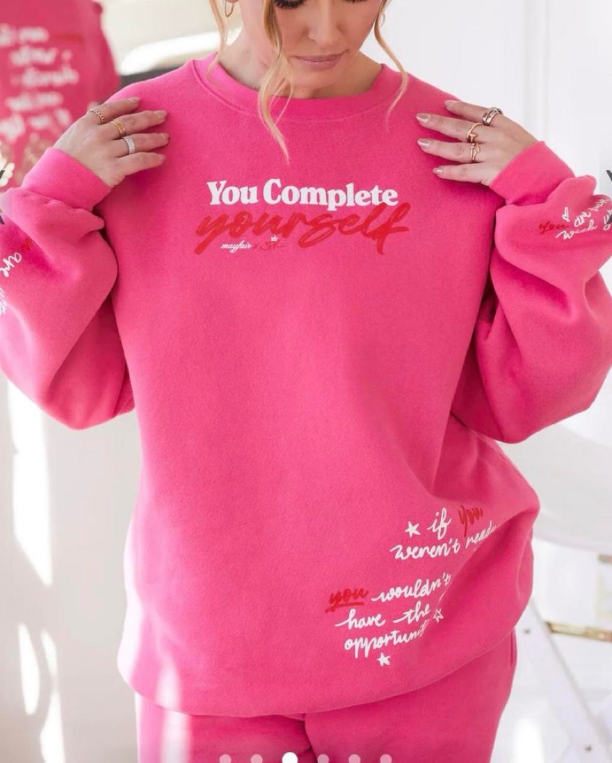 Super cute sweat set from the Mayfair Group x Serena Kerrigan in gorgeous pink with graphics that says “You Complete Yourself” and “You are the writer, director and star of your life.” Perfect sweat set for airport fits and loungewear!