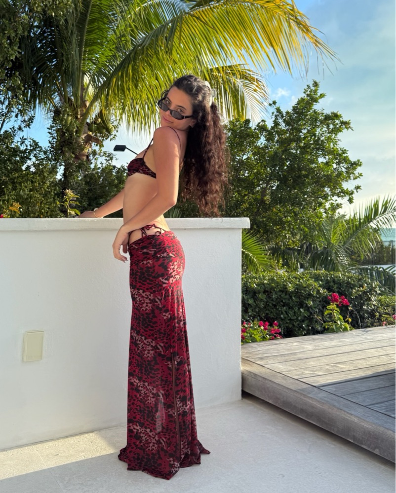 Tutti Printed Underwire Bikini Top in Asher & Red Frutti Skimpy Printed Side Ties Bikini Bottom in Asher & Red and Mickey Printed Maxi With Side Splits & Foldover Waist Panel Skirt in Asher & Red can be rented sep :)