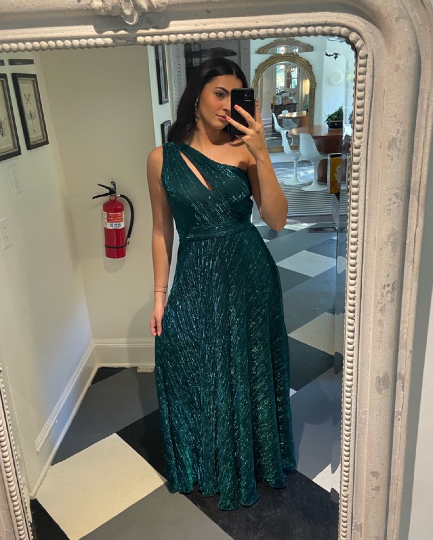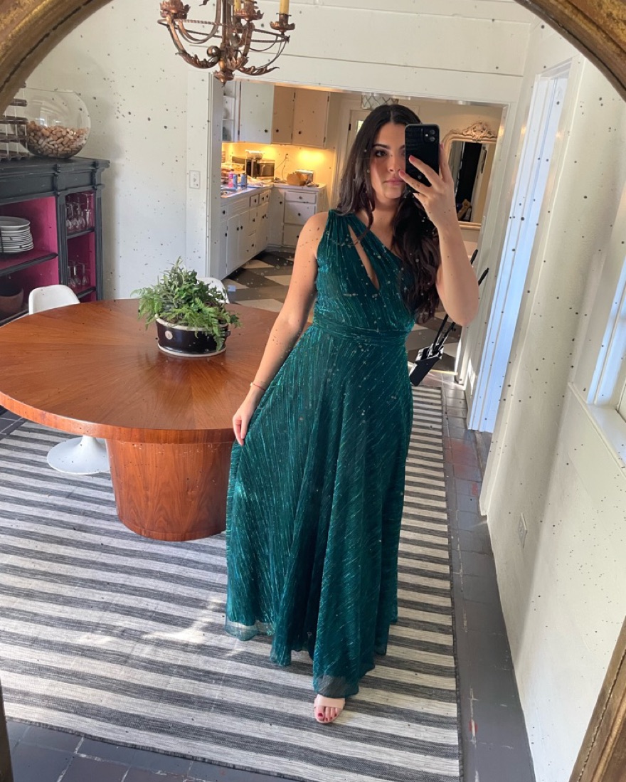 AQUA One Shoulder Crinkled Metallic Gown from Bloomingdales. The material is so comfortable I could dance all night & theres a slit on the side. Perfect wedding guest dress. I am 5’8” and wore 2 inch heels for length reference.