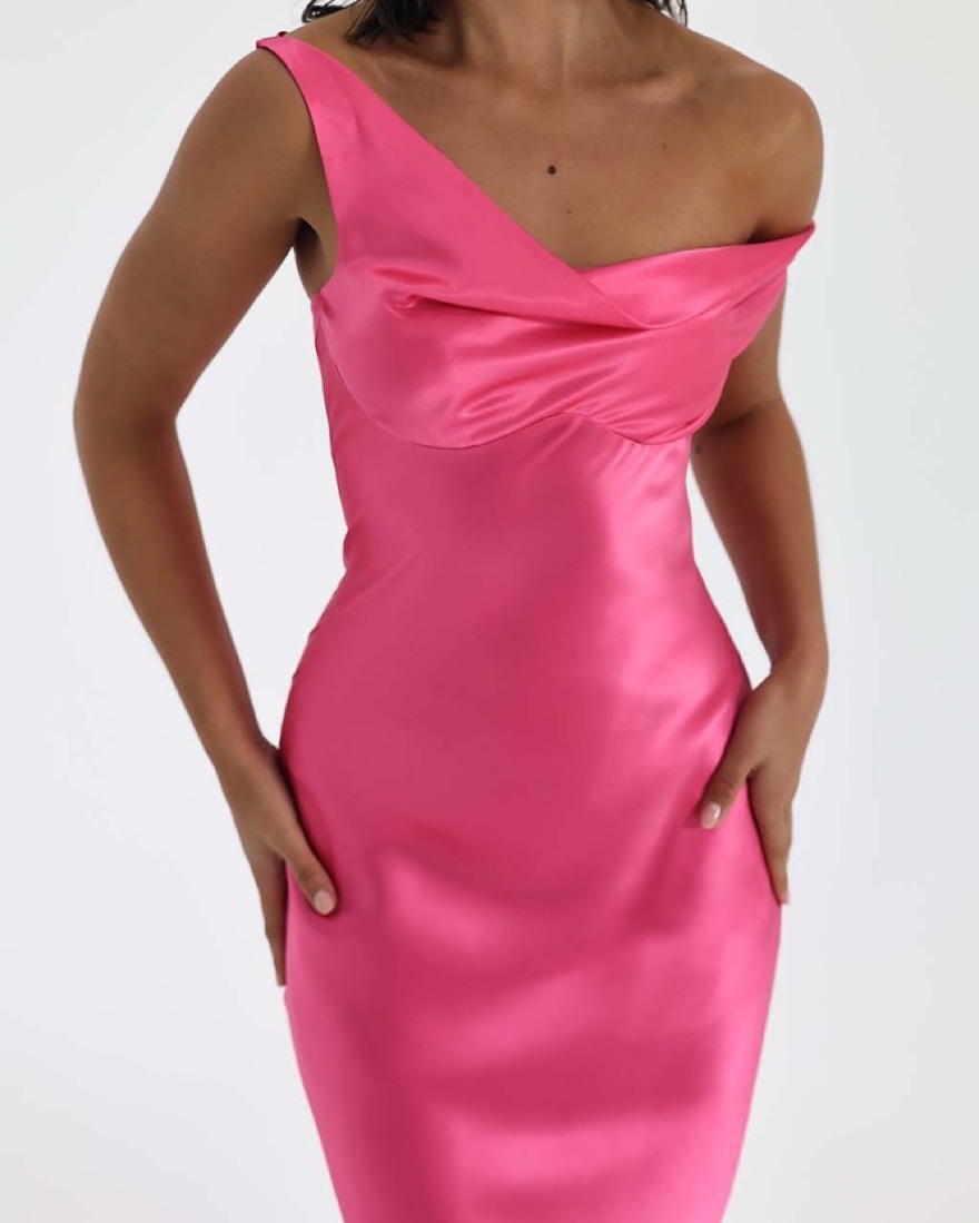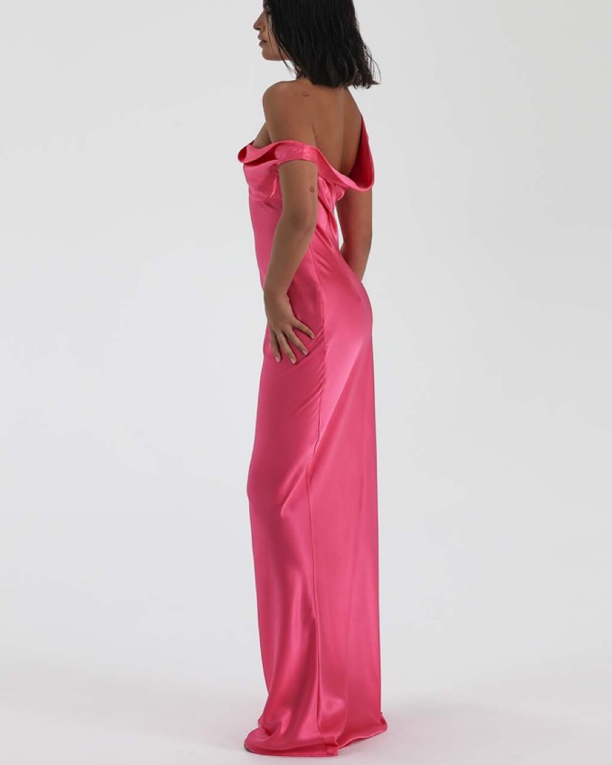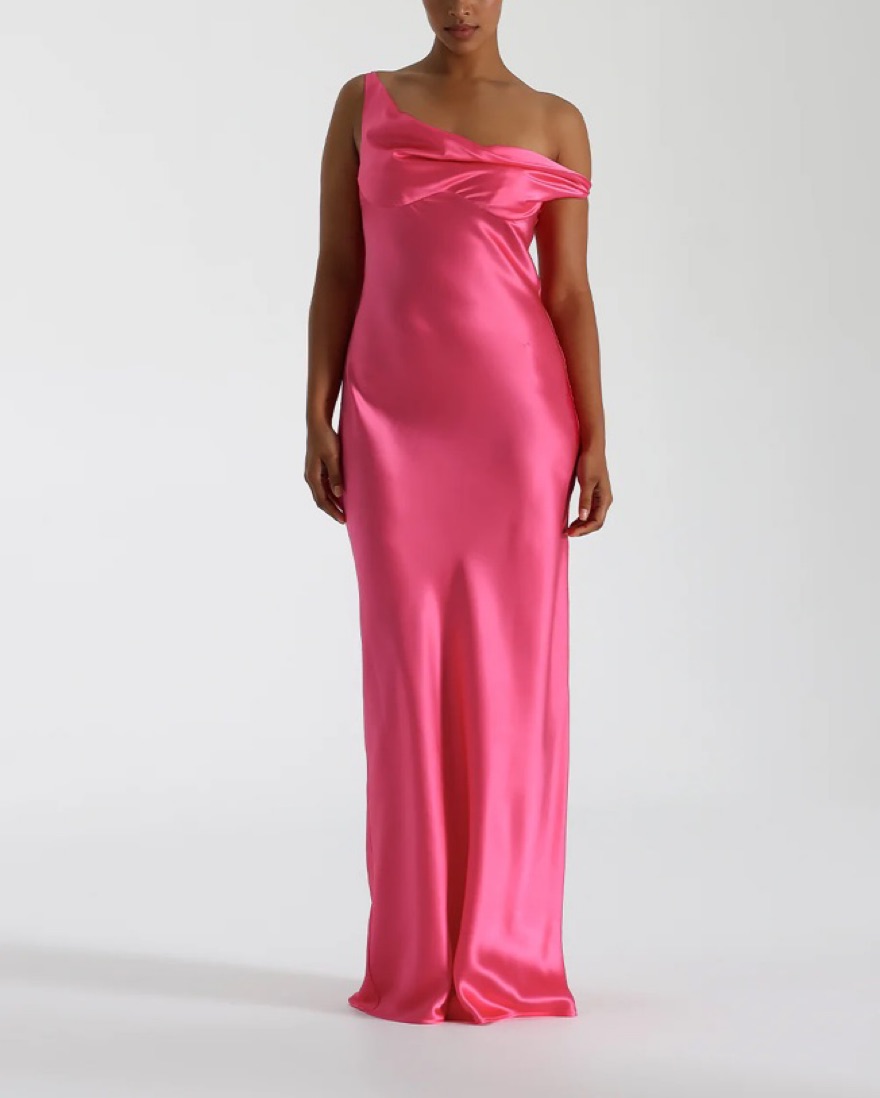 A bias cut silk gown featuring a seamlessly draped bust. The neckline effortlessly falls from the shoulder to create an asymmetrical shape, with a fitted bust cup lining for support.