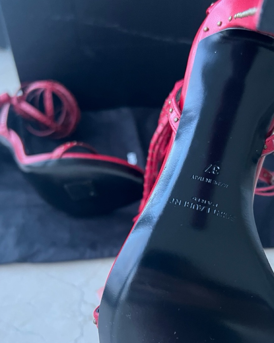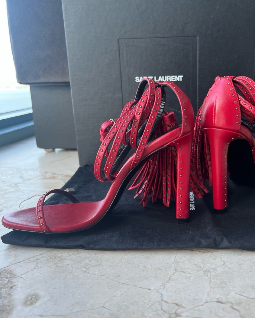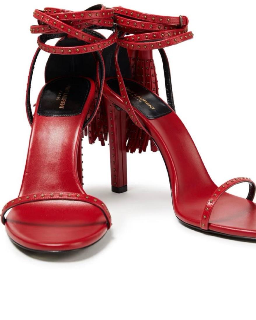 Stunning red leather w studded detailing & fringe accents. Unworn, new condition. Please take good care. 105mm heel = 4.13 inches