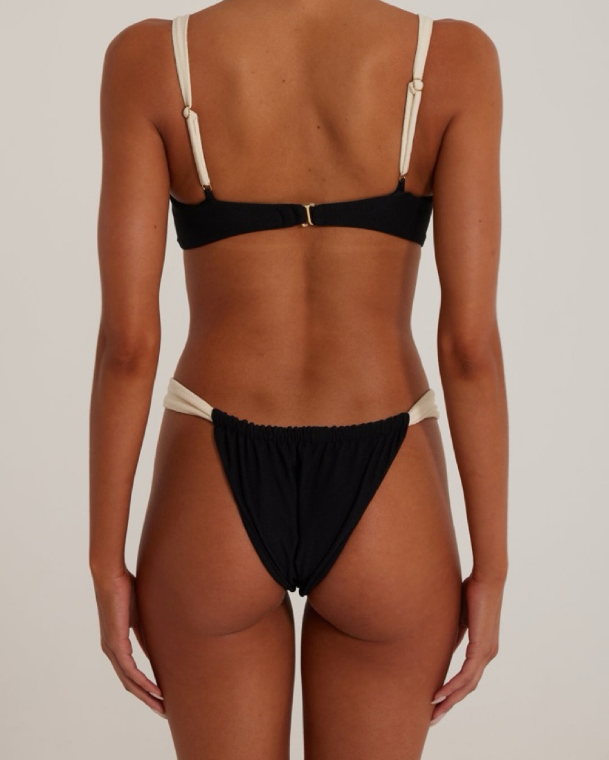 Underwire cup top with matching ruched bottom in faux suede black & cream