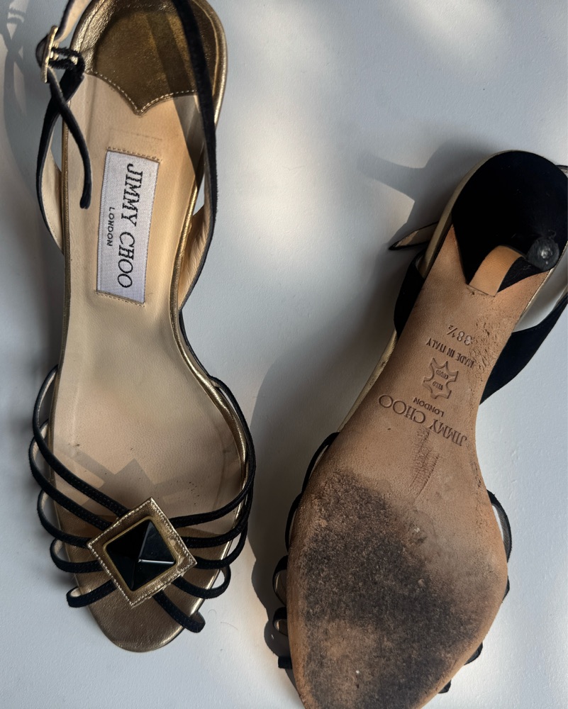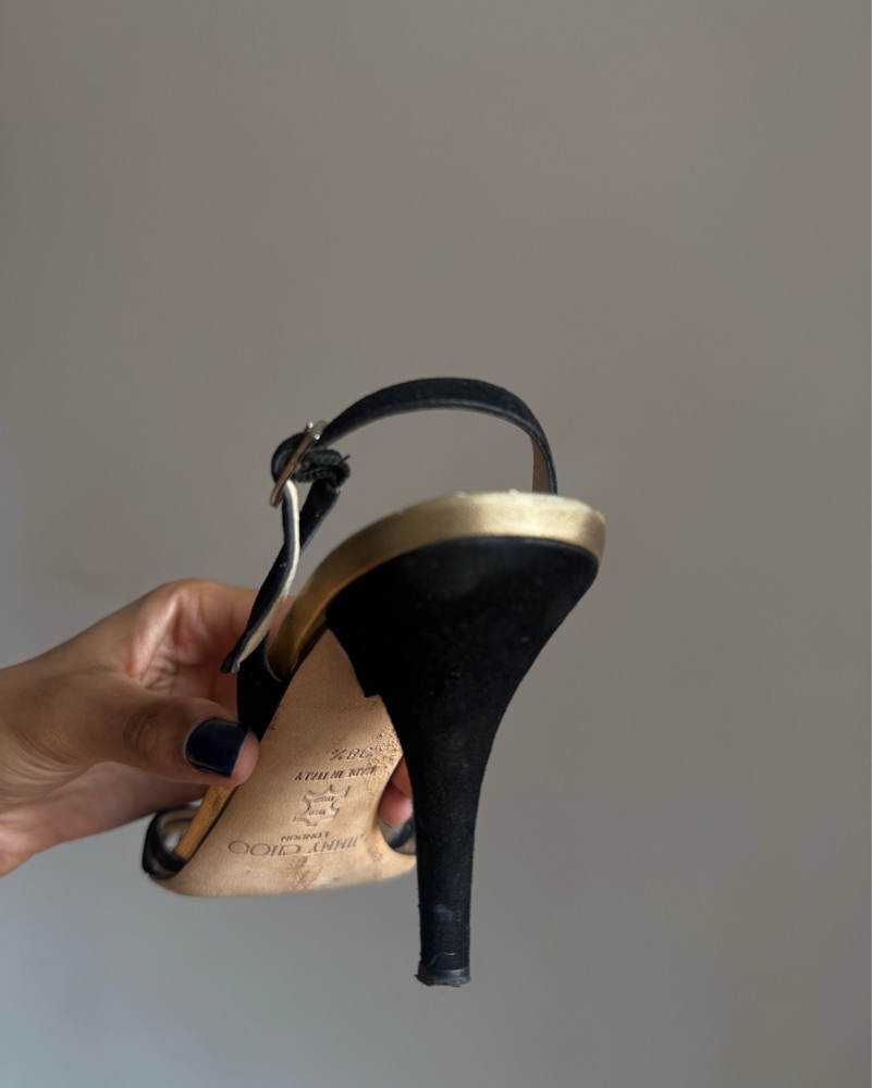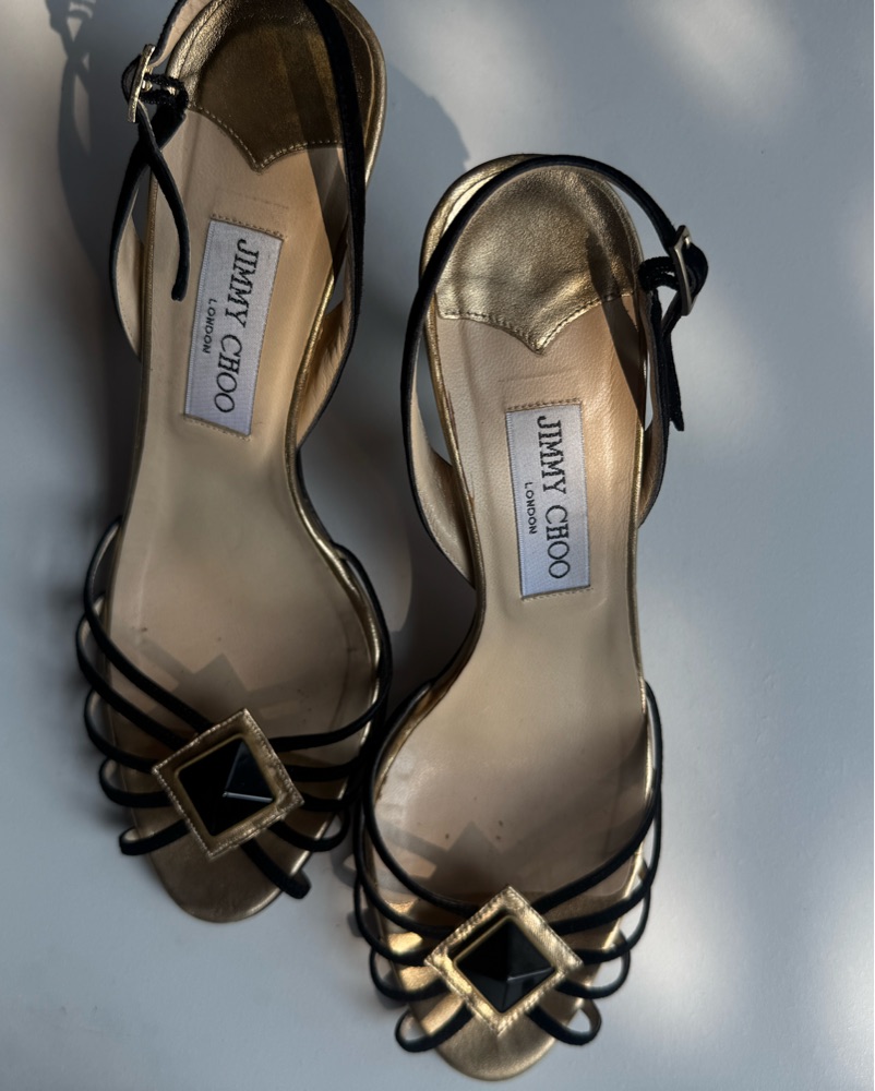 Black and gold opened toe Jimmy Choo heels. Great condition and super comfortable, good for occasion wear!