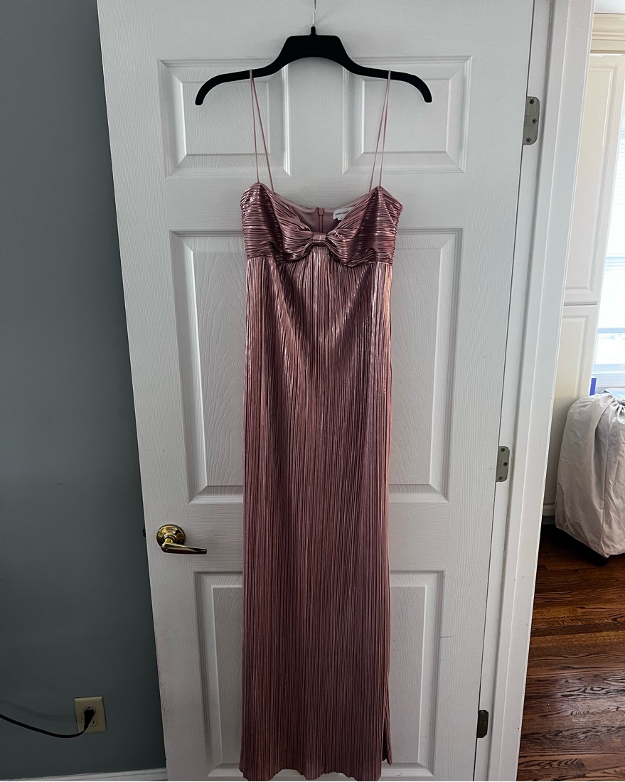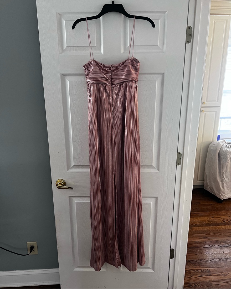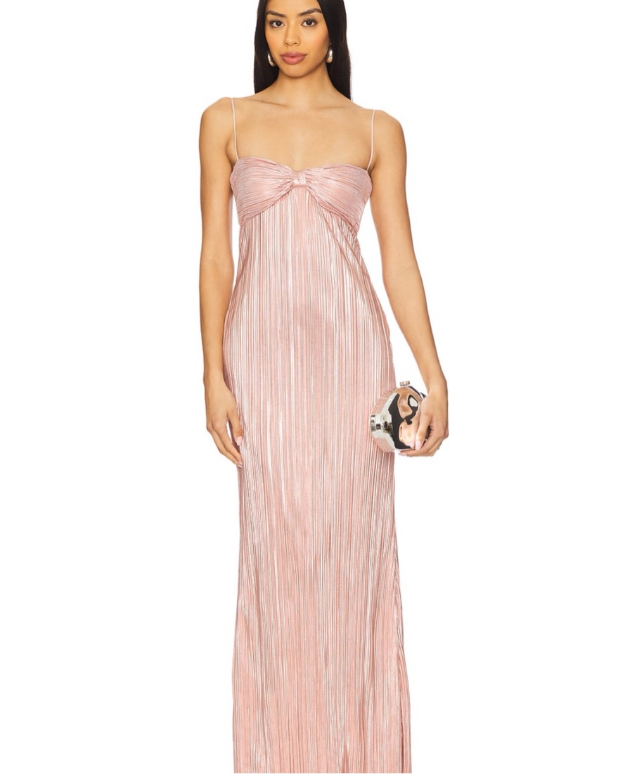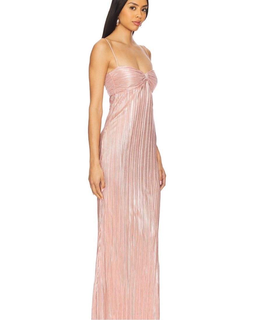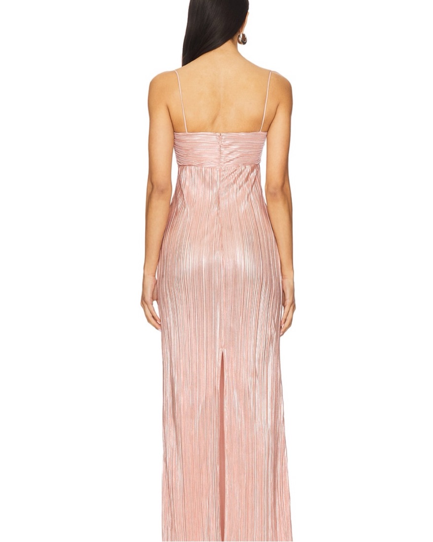 This metallic plissé gown has an effortlessly flattering fit, with a structured bodice and soft drape that flows beautifully on any figure. The design is versatile enough to be worn pregnant or not, making it a timeless option that feels elegant and comfortable for any special occasion.