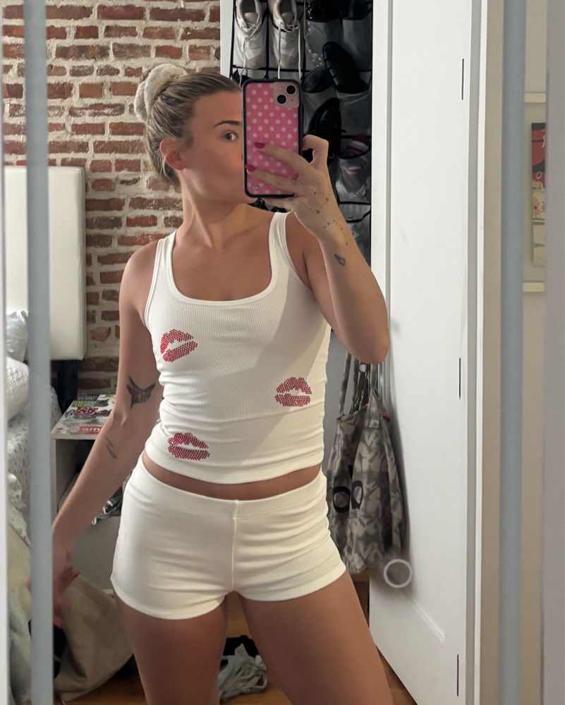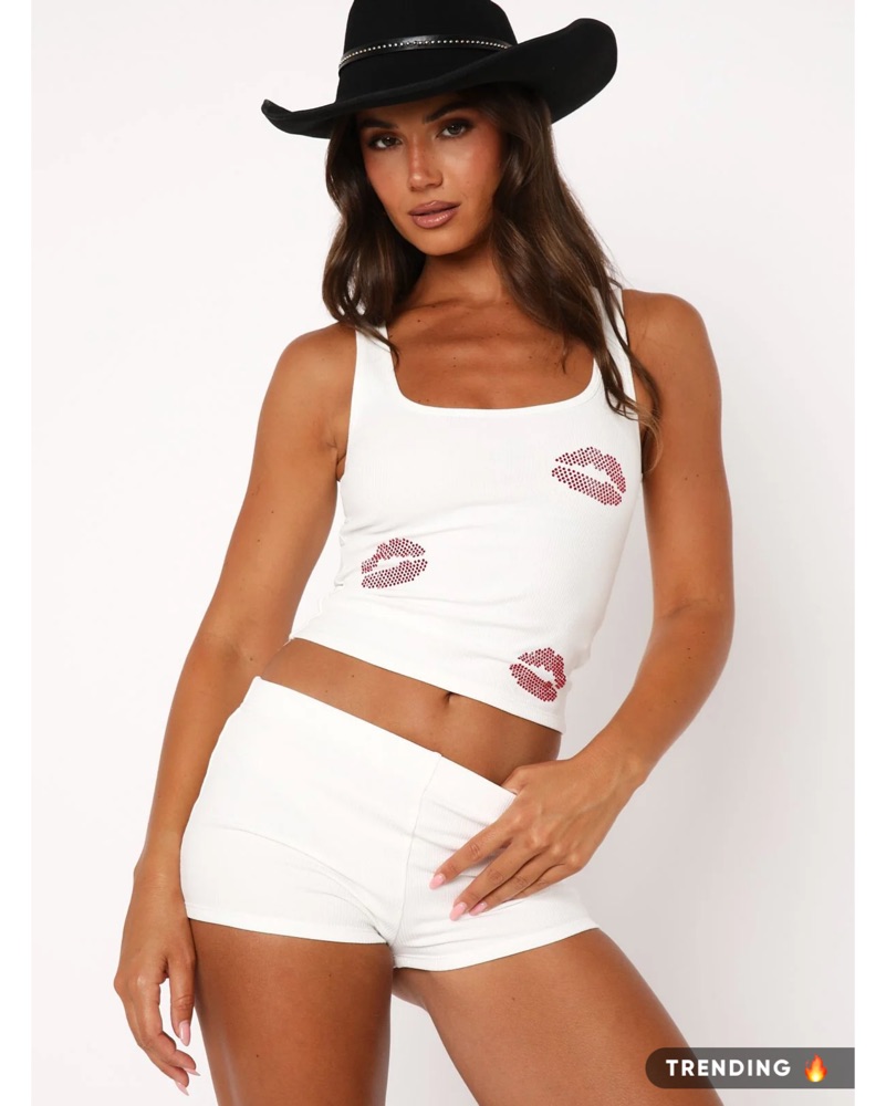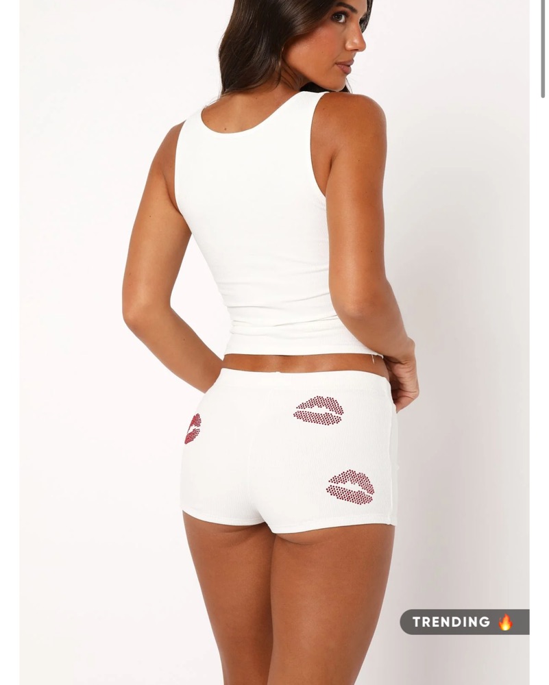 This chic and flirty set is perfect for a night out or a fun summer event. The white tank top and matching shorts feature a cute lip print design that adds a playful touch to your look. Can rent as a set or separates! Just message me! Super cute and comfy - not see through!! Double lined fabric