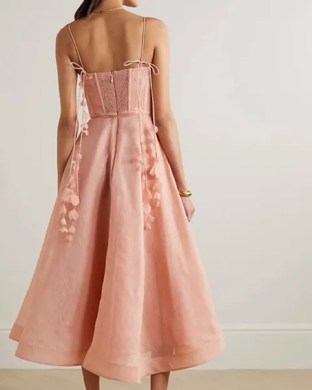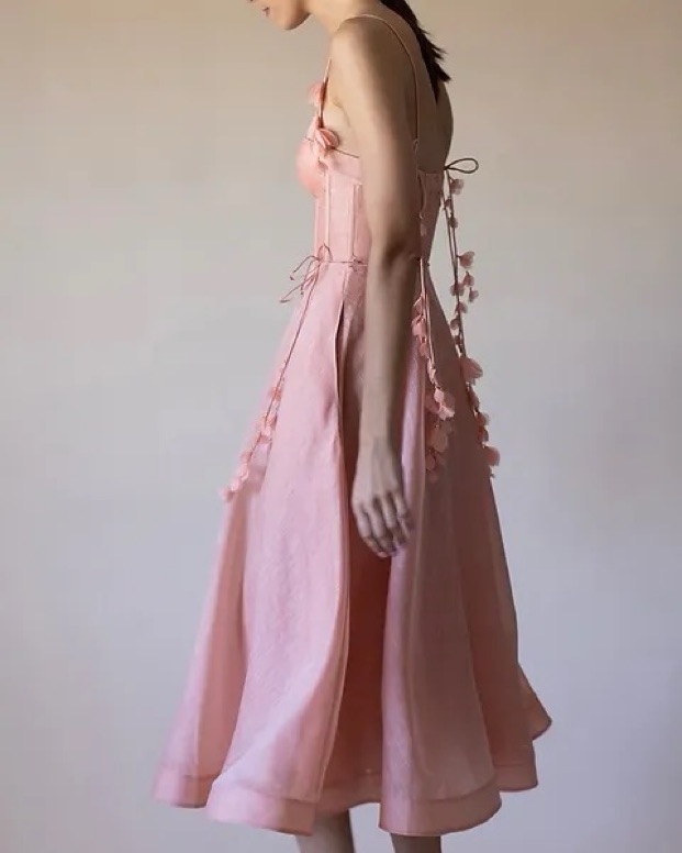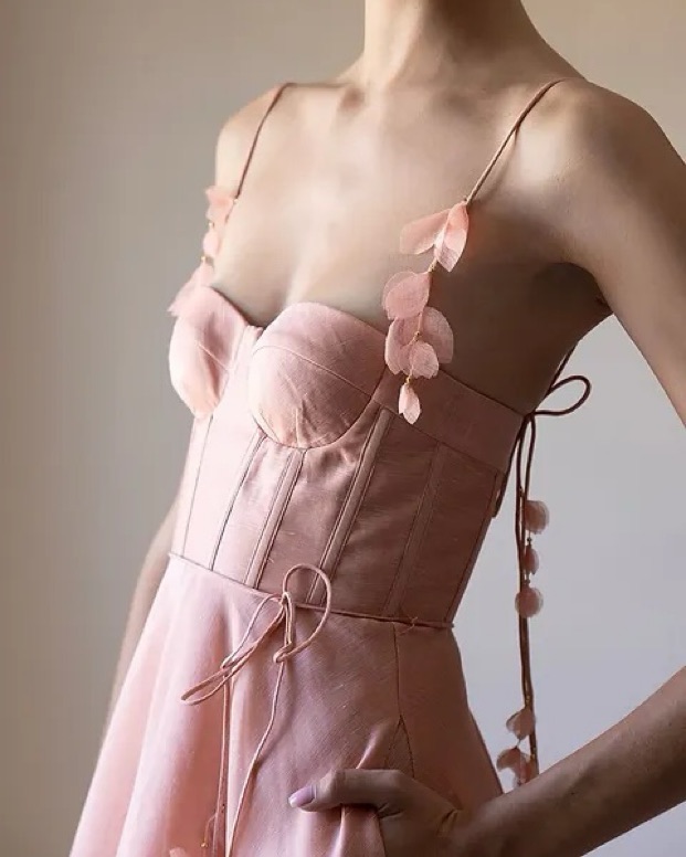 Size AU2/US6-8. Part of the 'Wonderland' collection for Spring '23, this dusty pink dress is made from lightweight linen blended with silk for added softness and has a structured corset-inspired bodice. Floral appliqués decorate the whispy straps for an extra feminine finish.