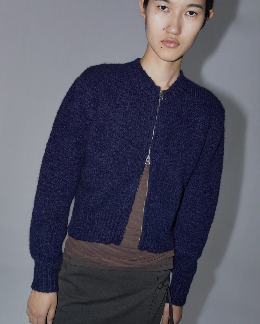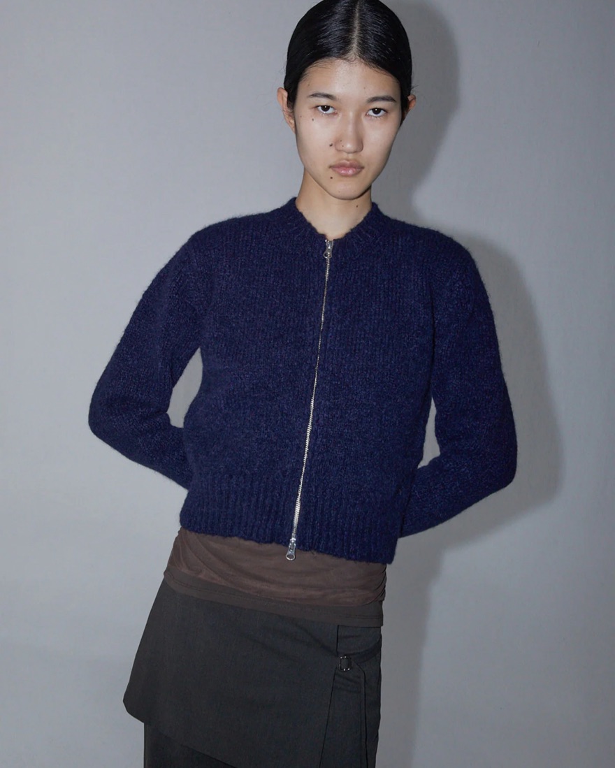 Cozy double zip sweater from Paloma. ‘With Pleasure’ in French on back. So perfect for fall. Color: Navy