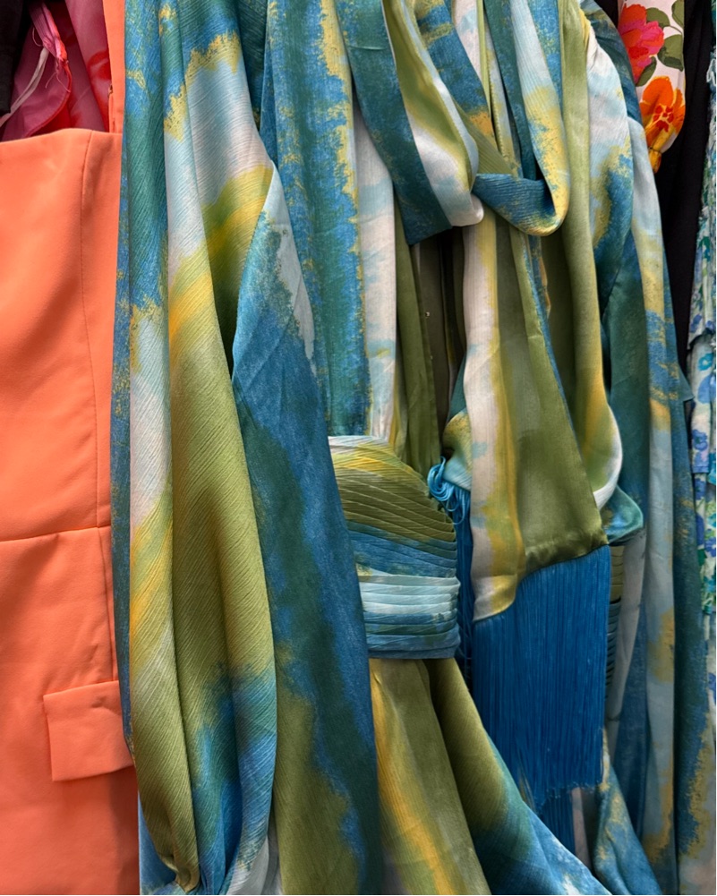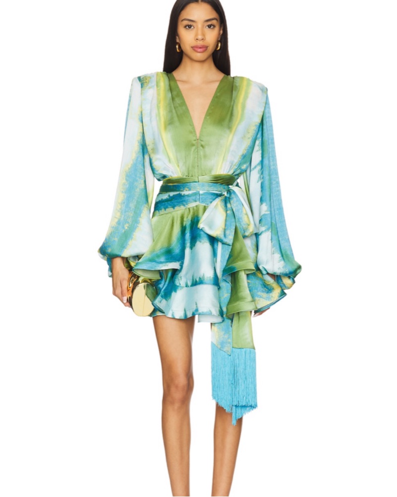 This stunning wrap dress features a bold floral print in shades of blue, green, and yellow. The billowing sleeves and flowing silhouette create a romantic, feminine look perfect for a spring or summer occasion.